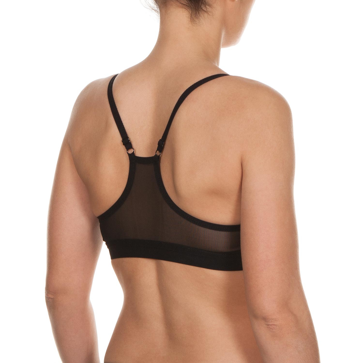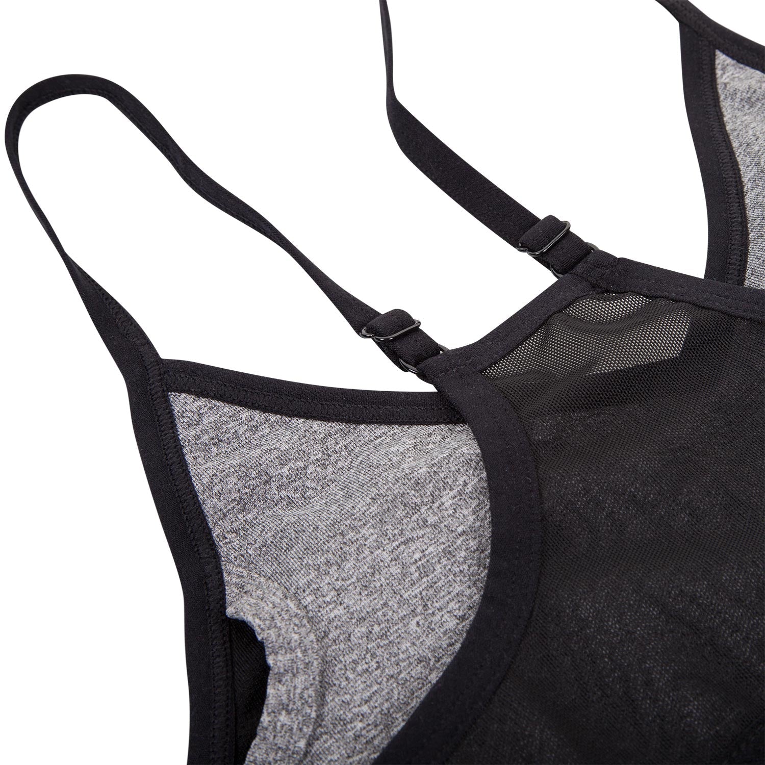 Cette brassière de sport sans armatures est pourvue de fines bretelles réglables pour un ajustement personnalisé.