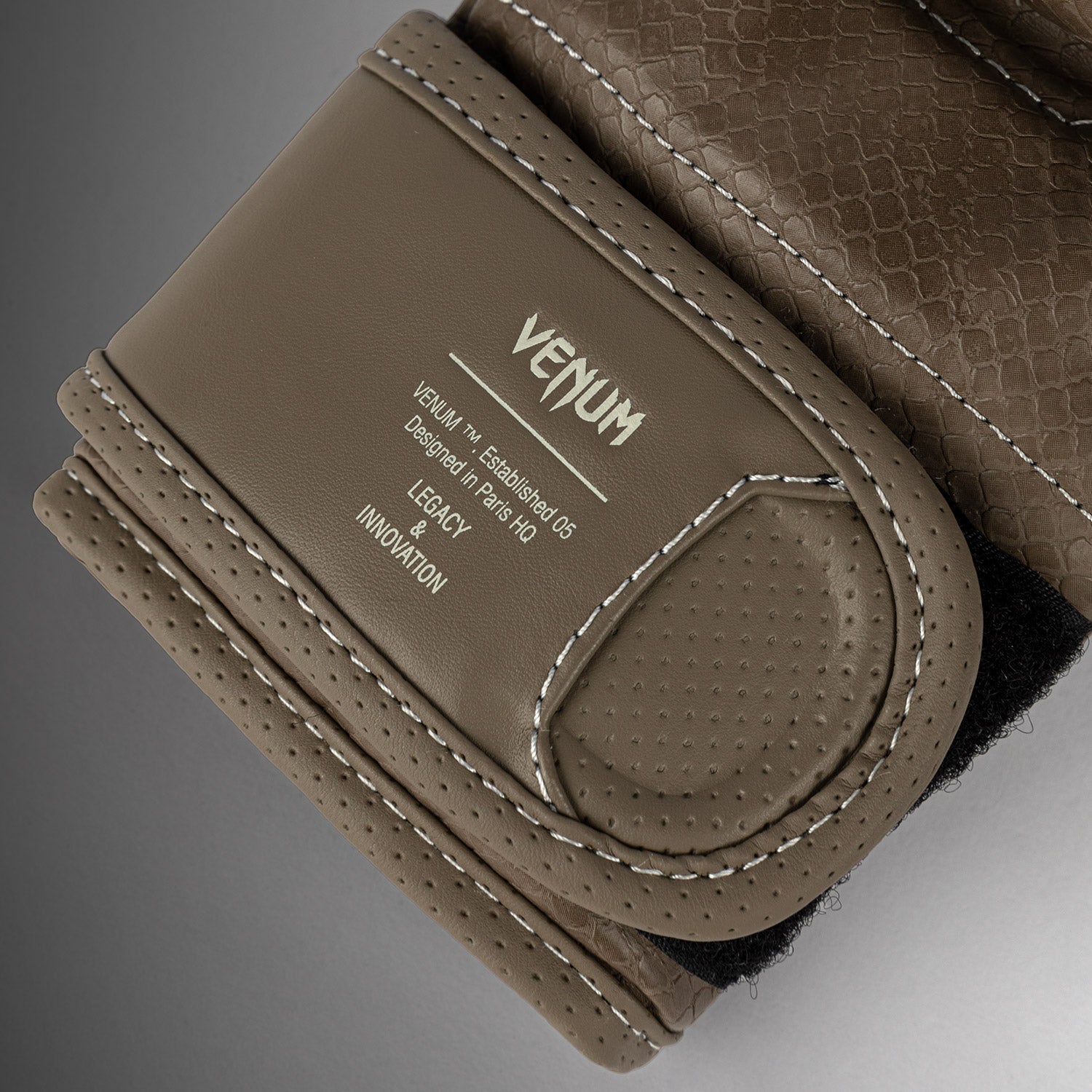 Une surpiqûre beige suit les lignes anatomiques du gant pour un effet contraste subtil. De plus, les écailles texturées recouvrent la surface, rappelant l’esprit combatif : frappez fort et vite avec Venum.