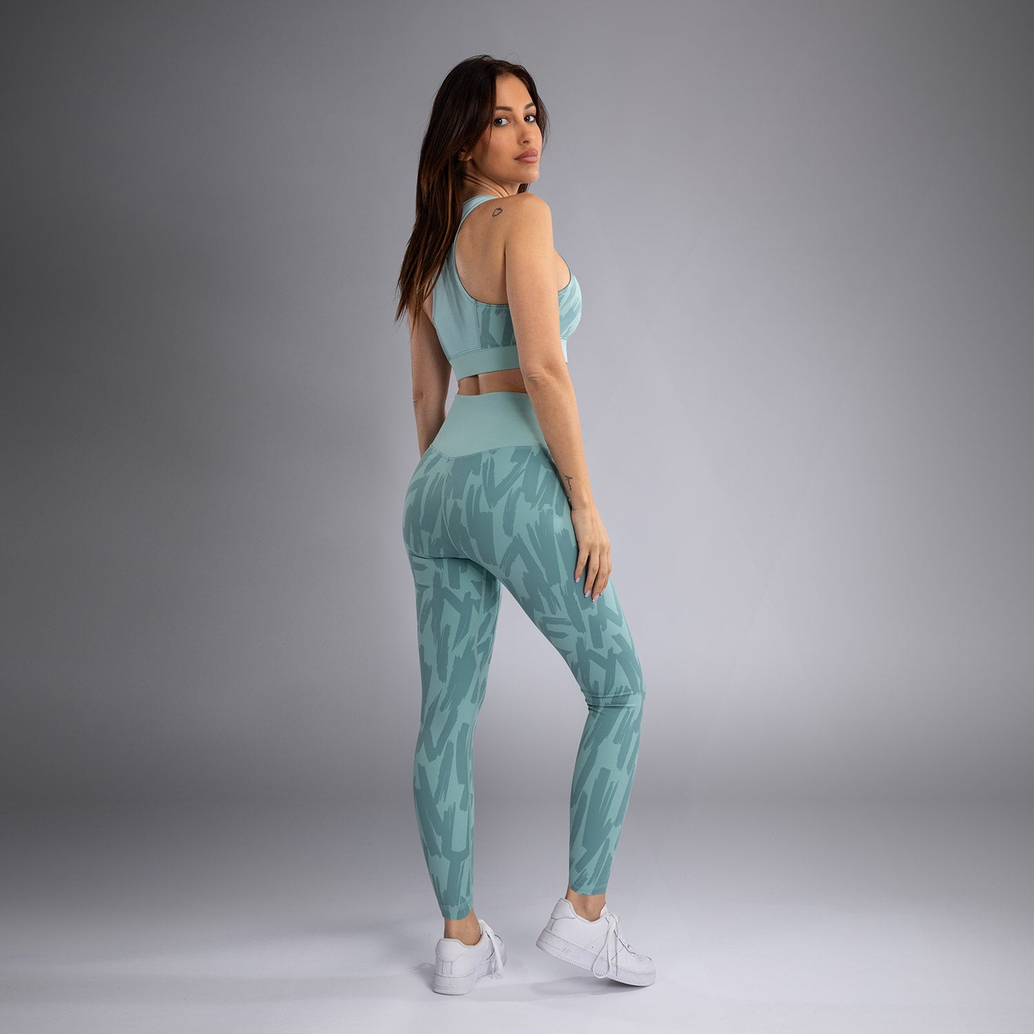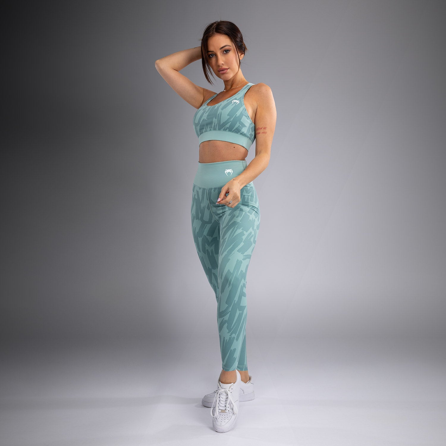 Les leggings longs Venum Graffiti pour femmes en aqua sont taille haute et conçus pour résister aux squats, avec un motif graffiti ton sur ton et le logo blanc de Venum imprimé sur la hanche. Le tissu est légèrement compressif mais léger, offrant une sensation douce et à peine perceptible.