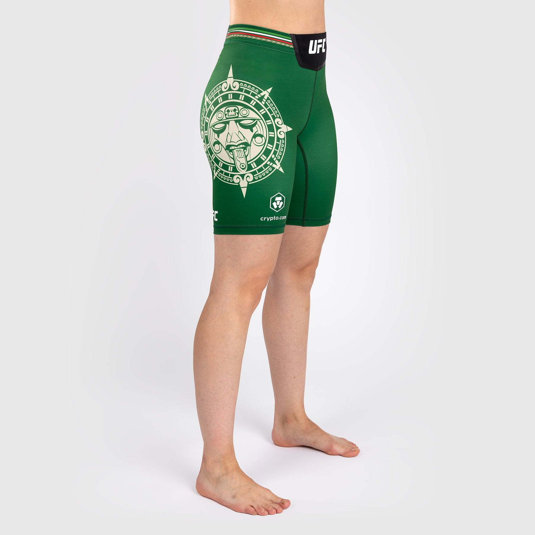 Le Noche UFC par Venum Authentic Fight Night Women's Vale Tudo Short - Long Fit en vert présente le graphique d'une pierre solaire, mettant en avant le coiffe complexe Tōnatiuh, la divinité aztèque du jour et de la nuit.
