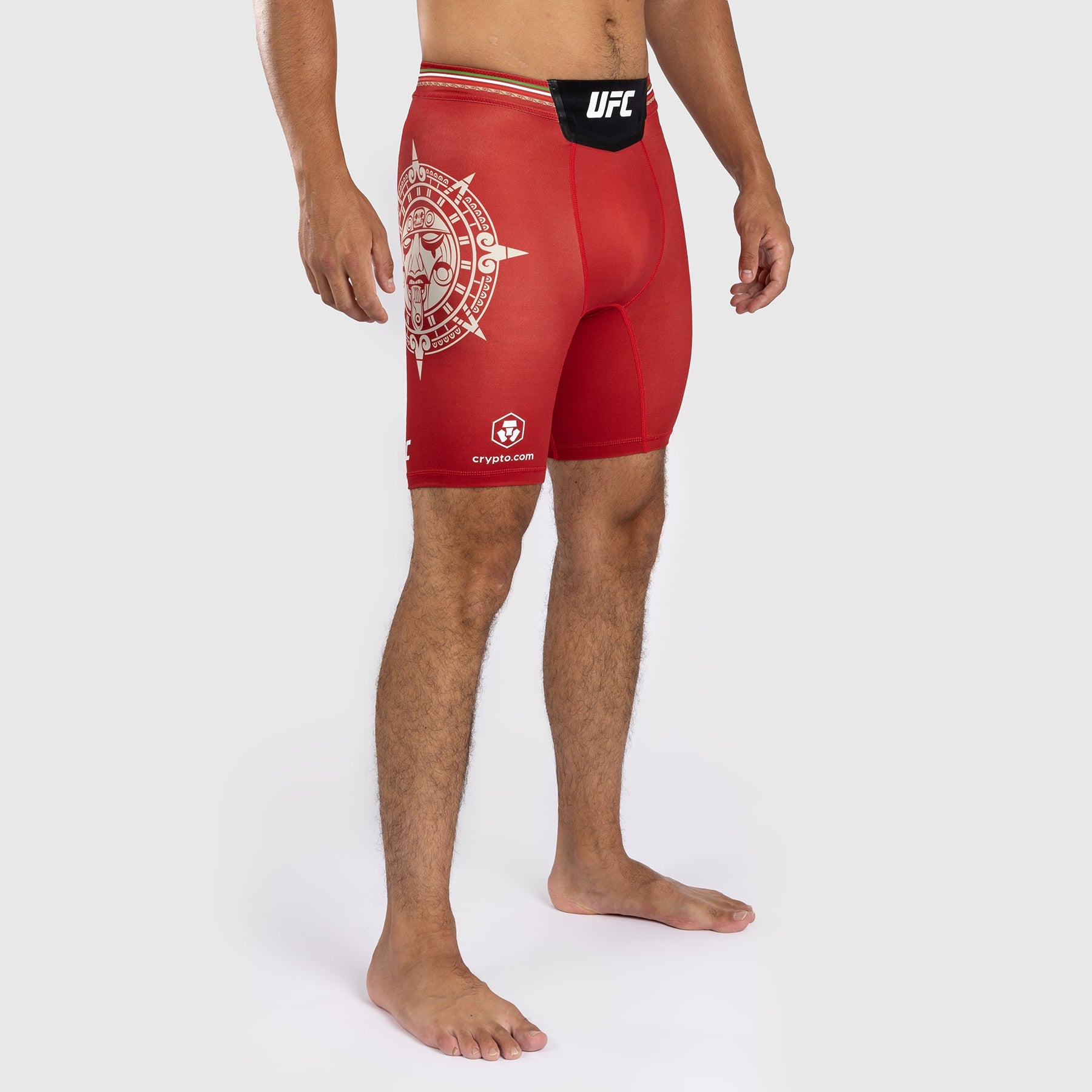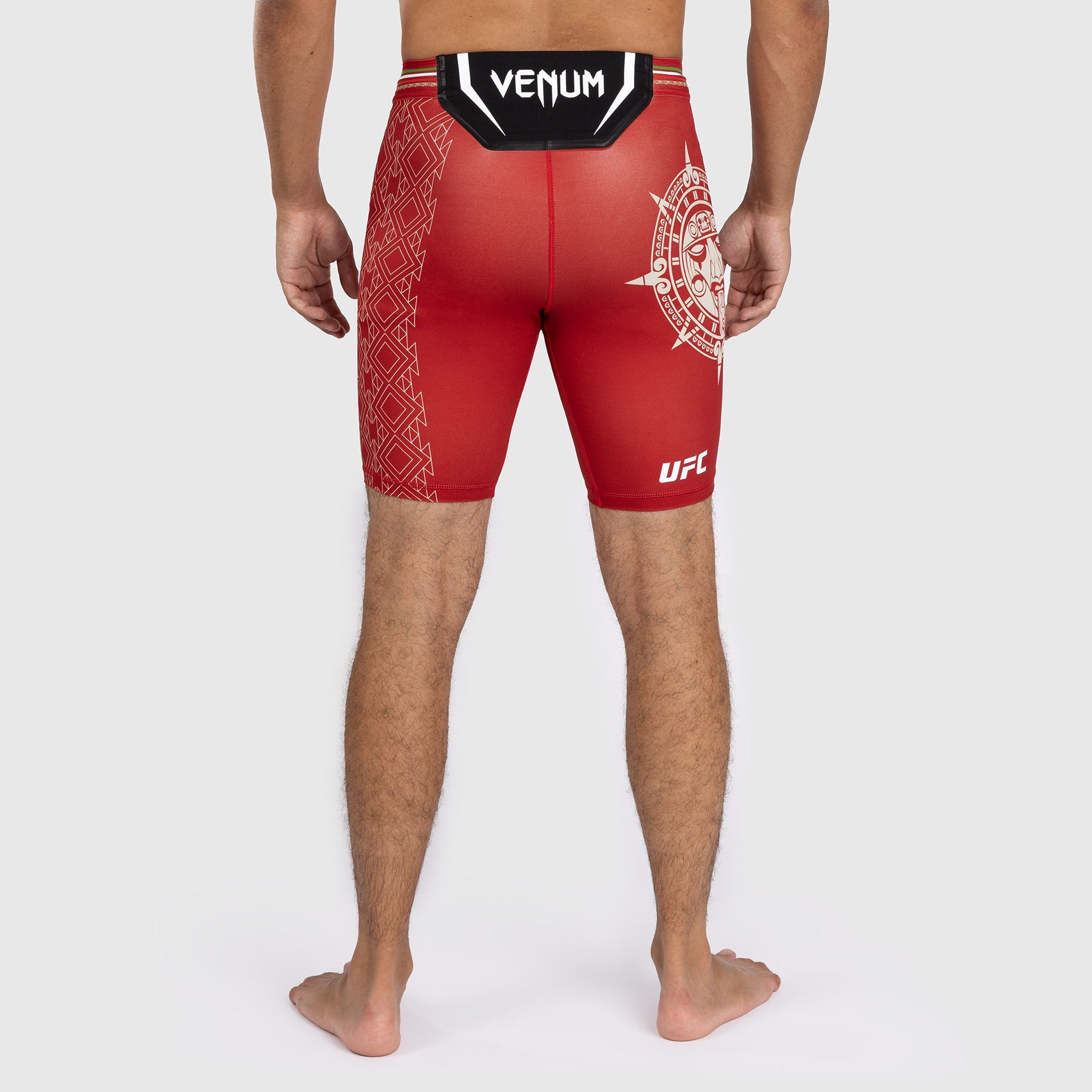 Le short Vale Tudo pour hommes Noche UFC par Venum Authentic Fight Night en rouge présente le graphisme d'une pierre du soleil, mettant en avant le coiffe complexe de Tōnatiuh, la divinité aztèque du jour et de la nuit.