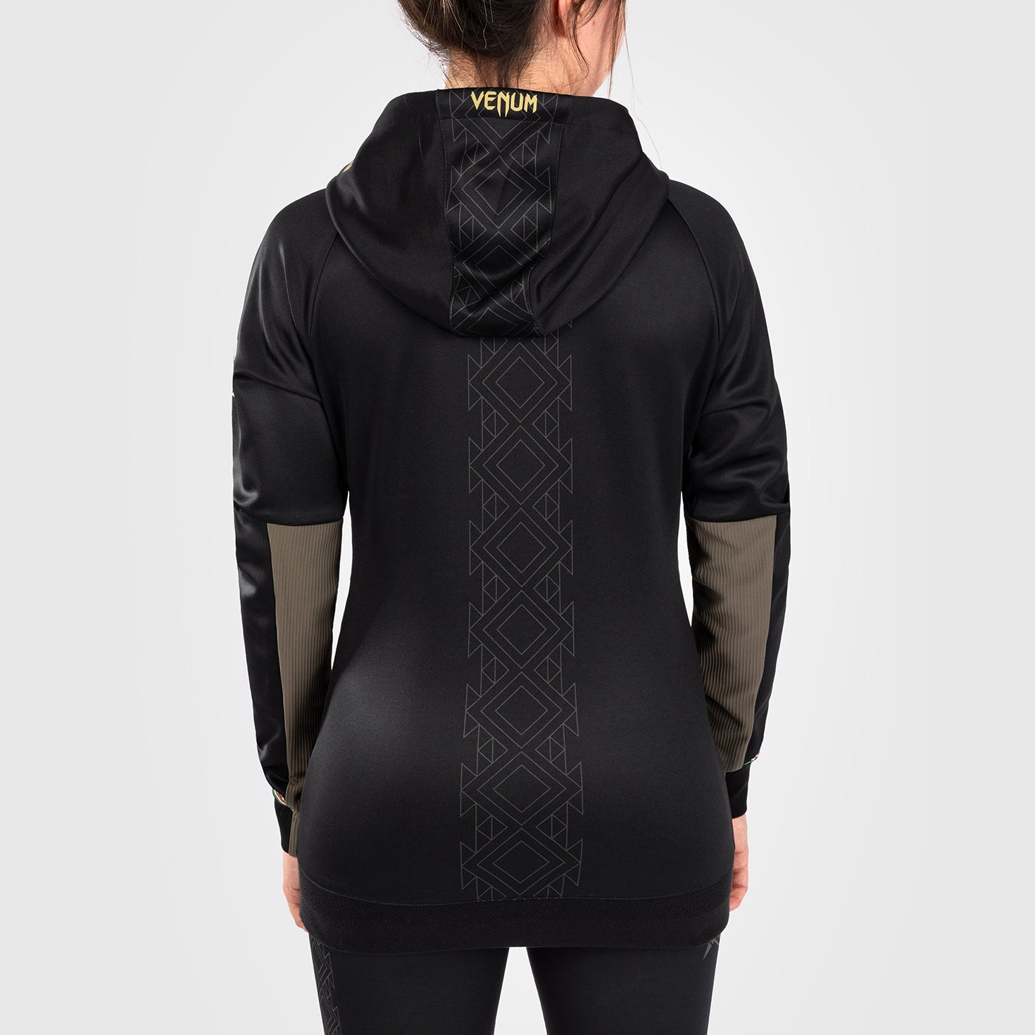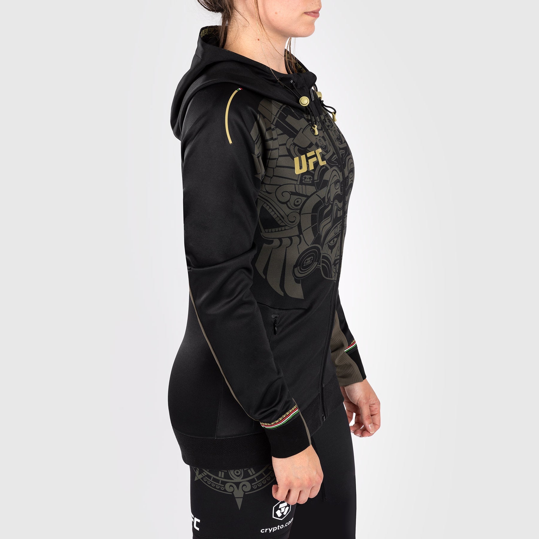 Le Noche UFC Authentic Fight Night par Venum Women's Walkout Hoodie en noir présente cinq dieux aztèques primordiaux sur la poitrine et la capuche. Les têtes d'aigle s'élevant de chaque côté du graphique représentent Itzcuauhtli, symbolisant la résilience et le dévouement de l'esprit combatif du peuple mexicain.
