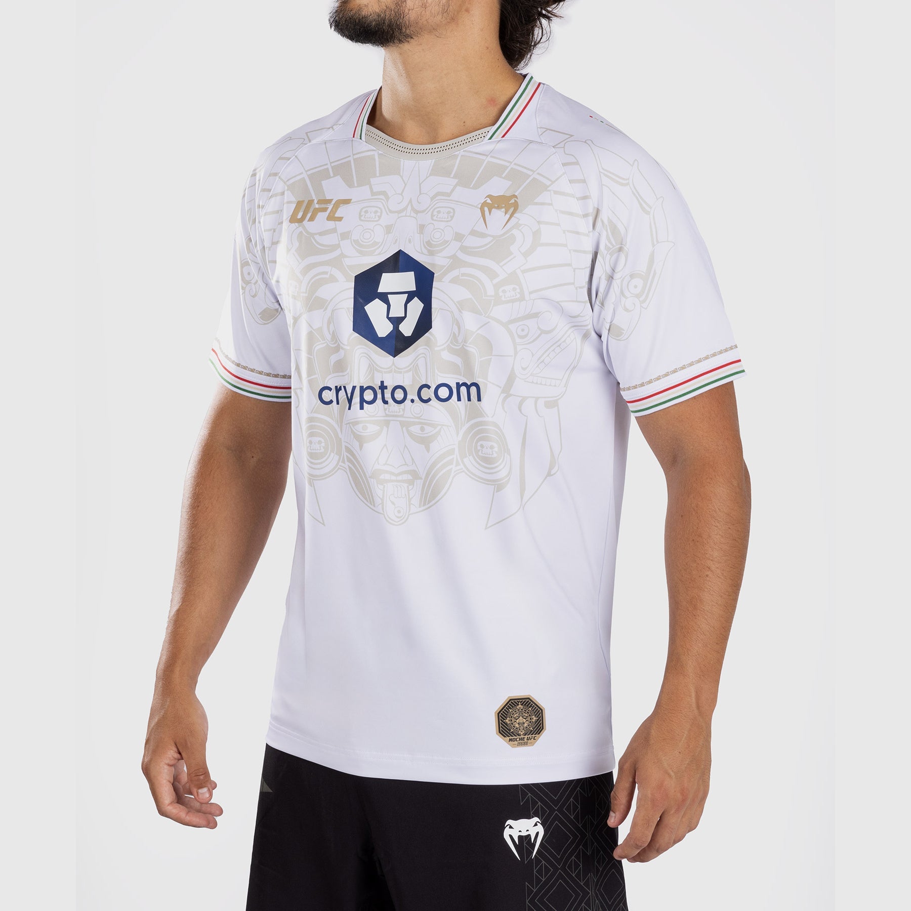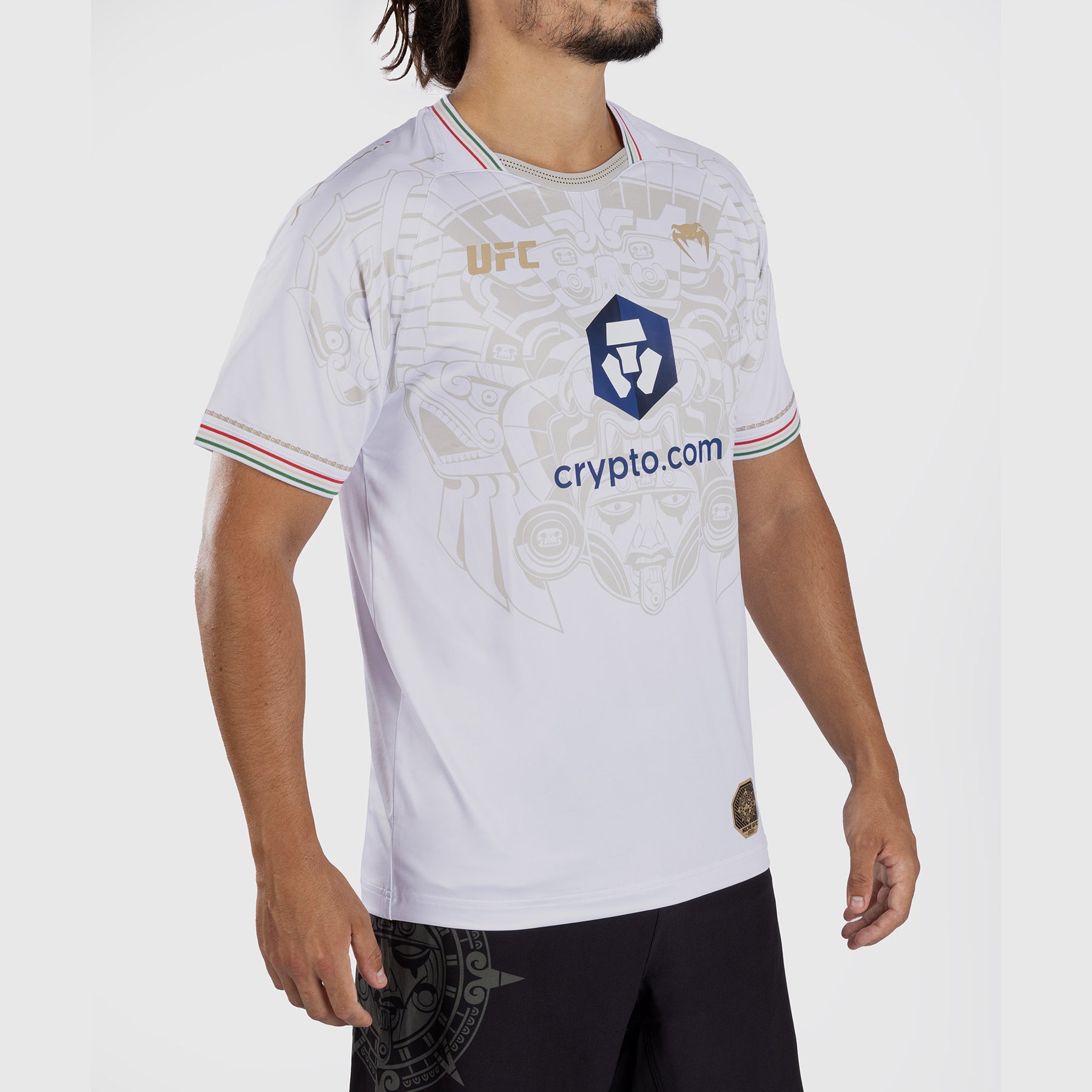 Le Noche UFC Authentic Fight Night par Venum Men’s Walkout Jersey en blanc présente cinq dieux aztèques primordiaux sur la poitrine. Les têtes d'aigle s'étendant de chaque côté du graphique représentent Itzcuauhtli, symbolisant la résilience et le dévouement de l'esprit combatif du peuple mexicain.
