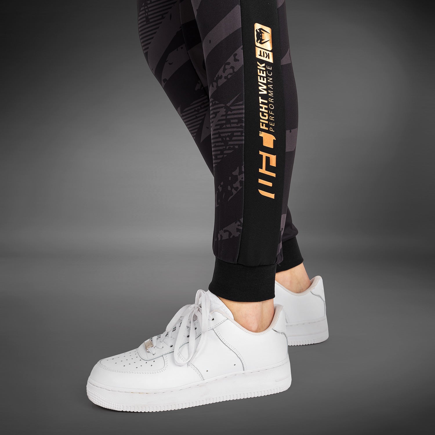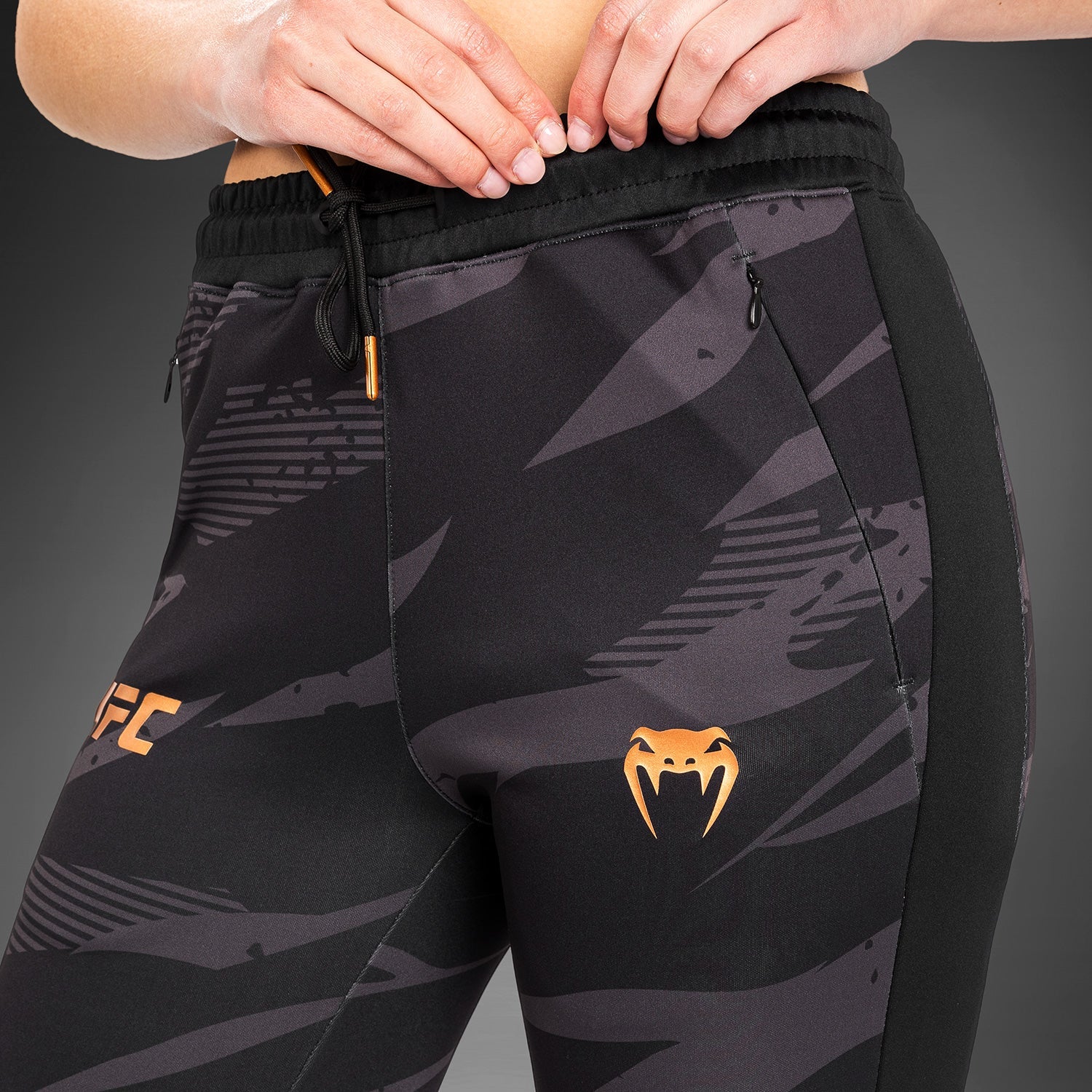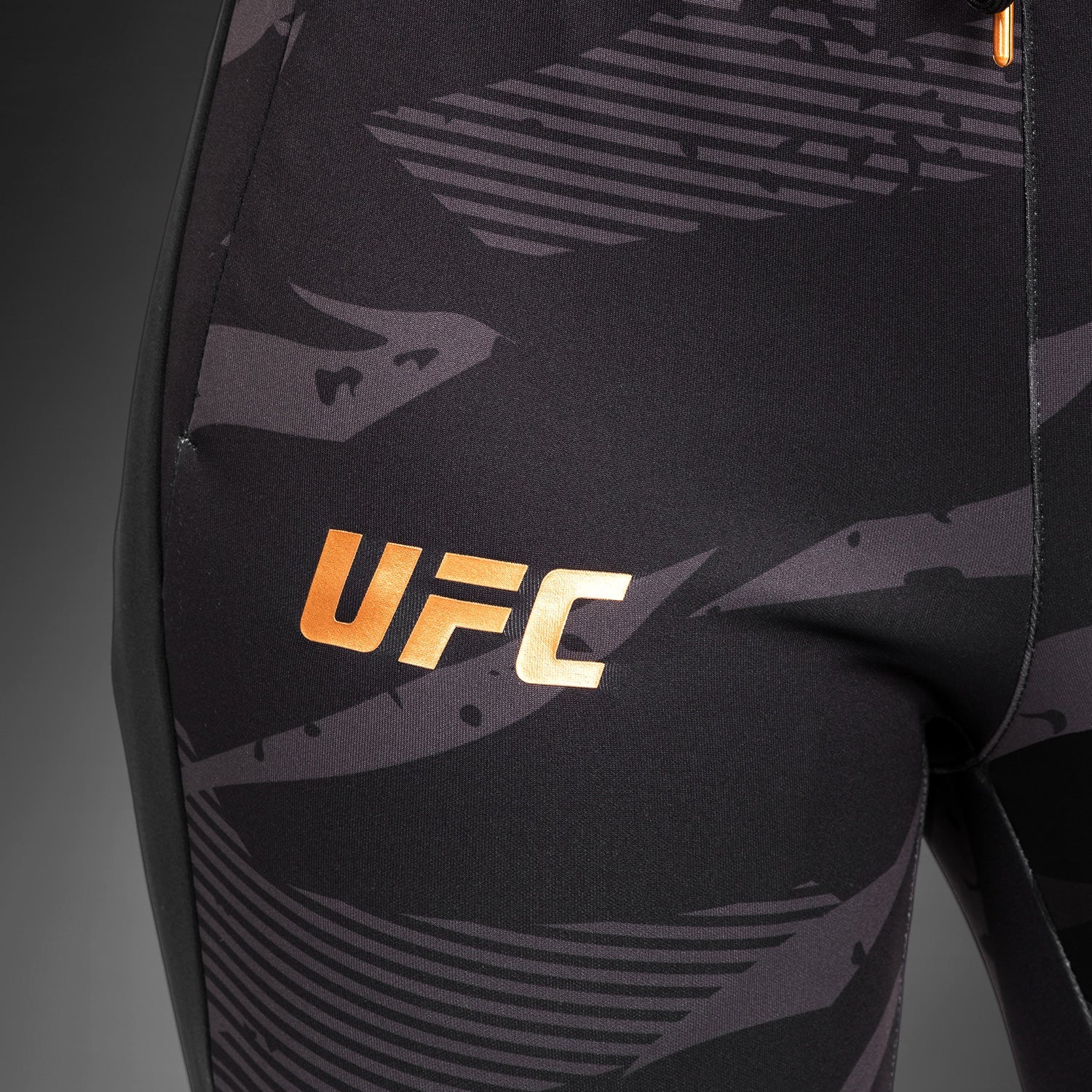 Son imprimé camouflage audacieux, agrémenté des logos en bronze de Venum et de l'UFC, s'inspire des athlètes qui pénètrent dans l'Octogone, prêts à frapper et à riposter.