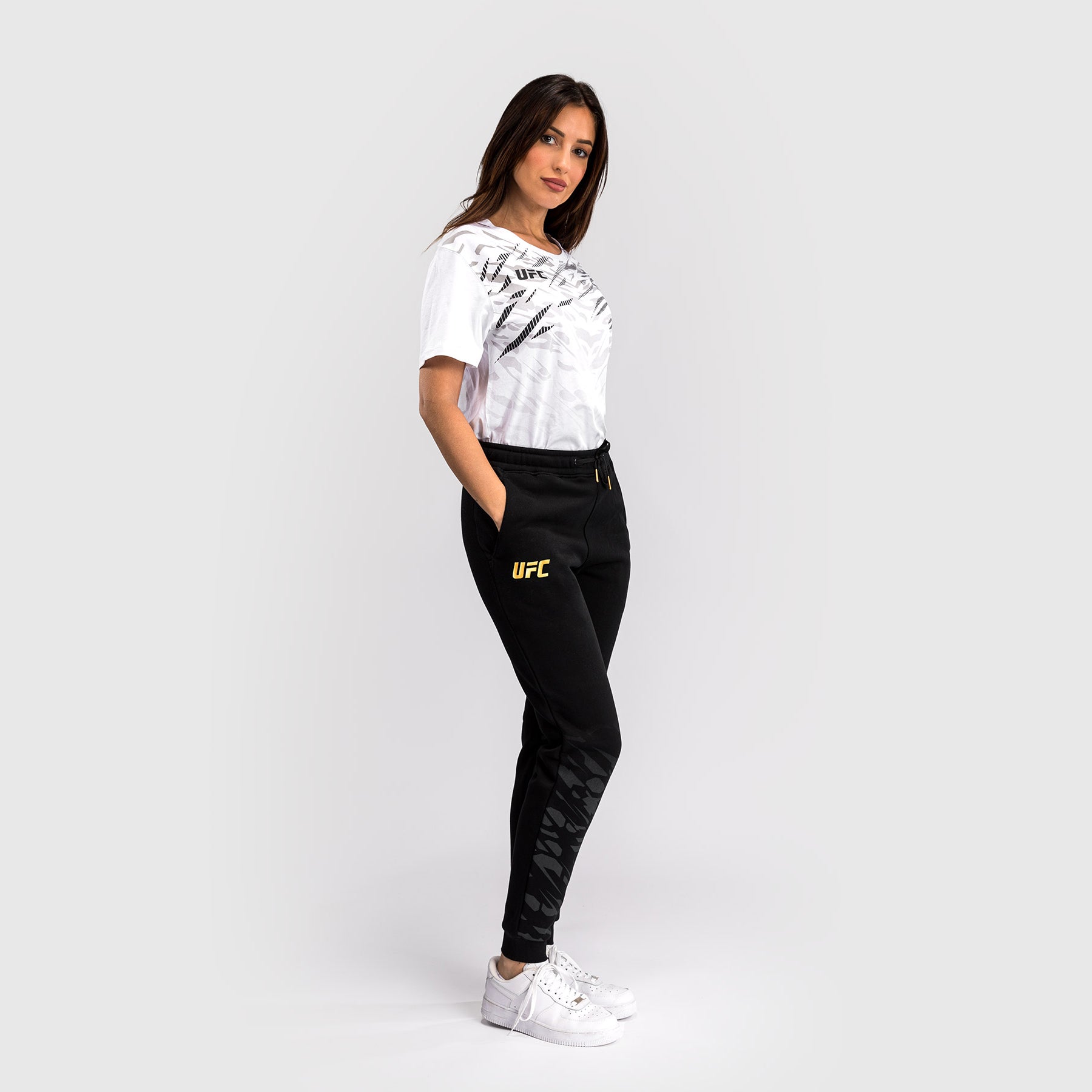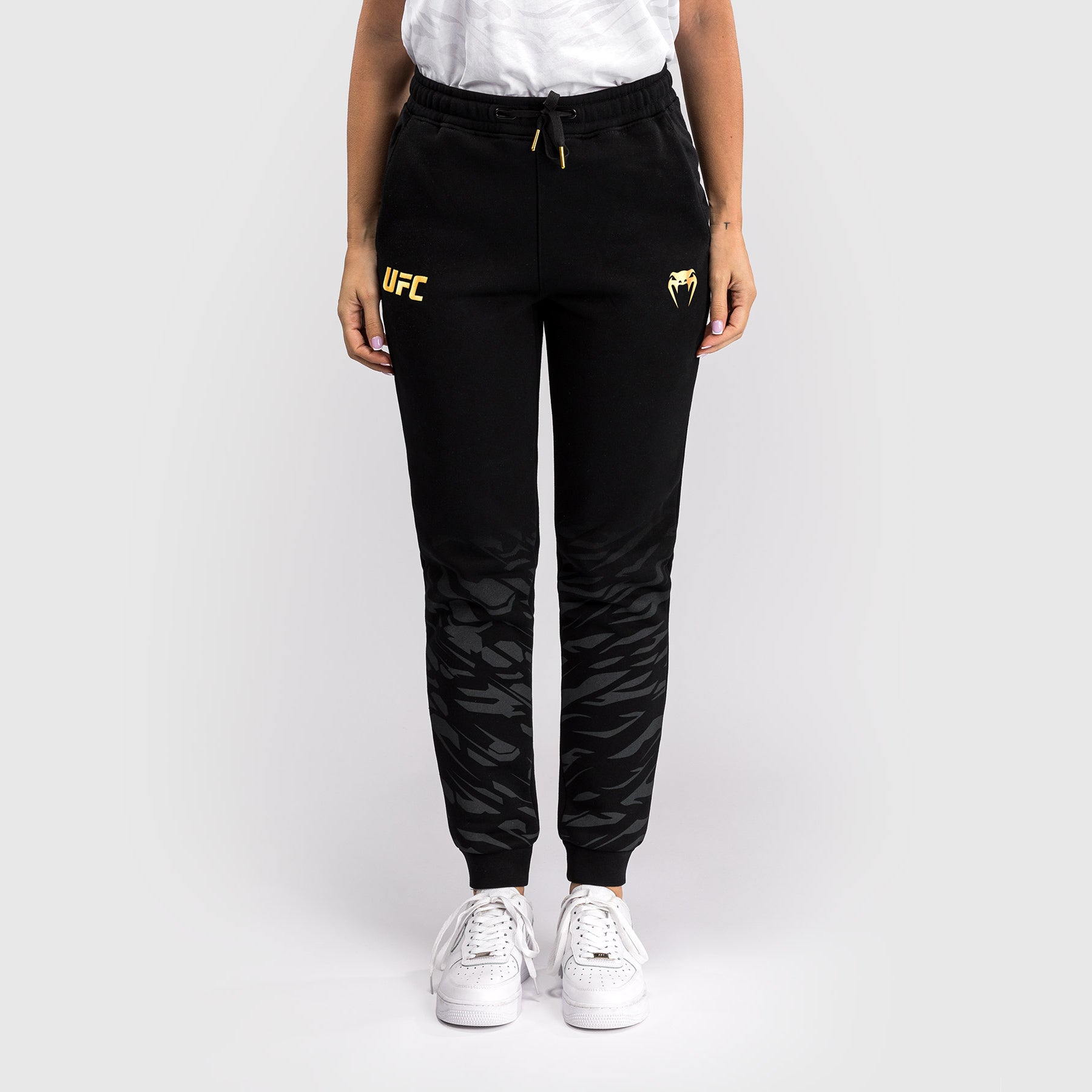 Les détails en blanc du logo Venum et de l'UFC au niveau des hanches ajoutent une finition à ces pantalons de survêtement décontractés. Cette combinaison de couleurs noir/or est réservée aux champions de l'UFC.