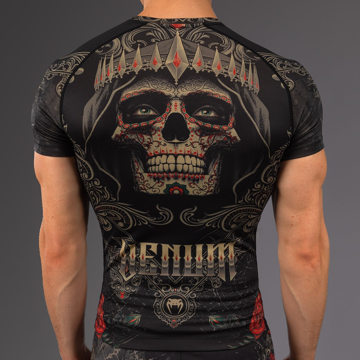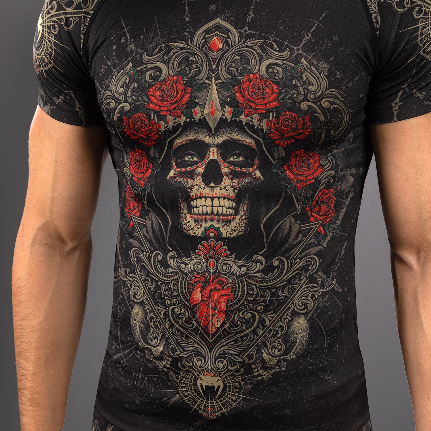 Le design noir et or saisissant de ce rashguard à manches courtes présente des graphismes gothiques ornés dédiés à La Santa Muerte. Associez-le aux guêtres et shorts de combat de la même collection.