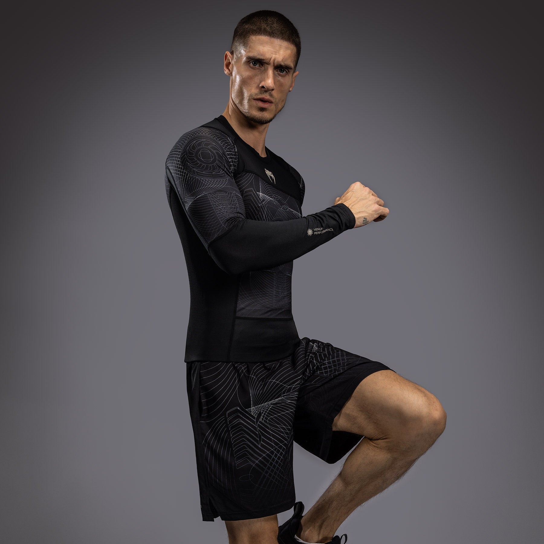 Le design moderne et sobre du rashguard à manches longues Venum G-Fit Air en Noir Profond/Sable Désert s'associe parfaitement avec les shorts de combat et les spats de la même collection.