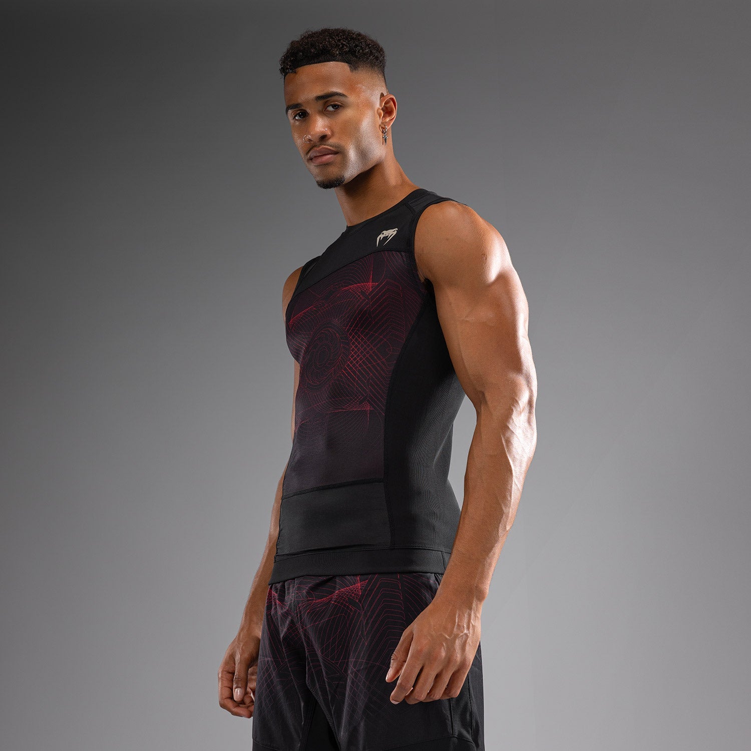 Le design moderne et sobre du Rashguard sans manches Venum G-Fit Air en Noir Profond/Rouge Feu s'associe parfaitement avec les shorts de combat et les spats de la même collection.