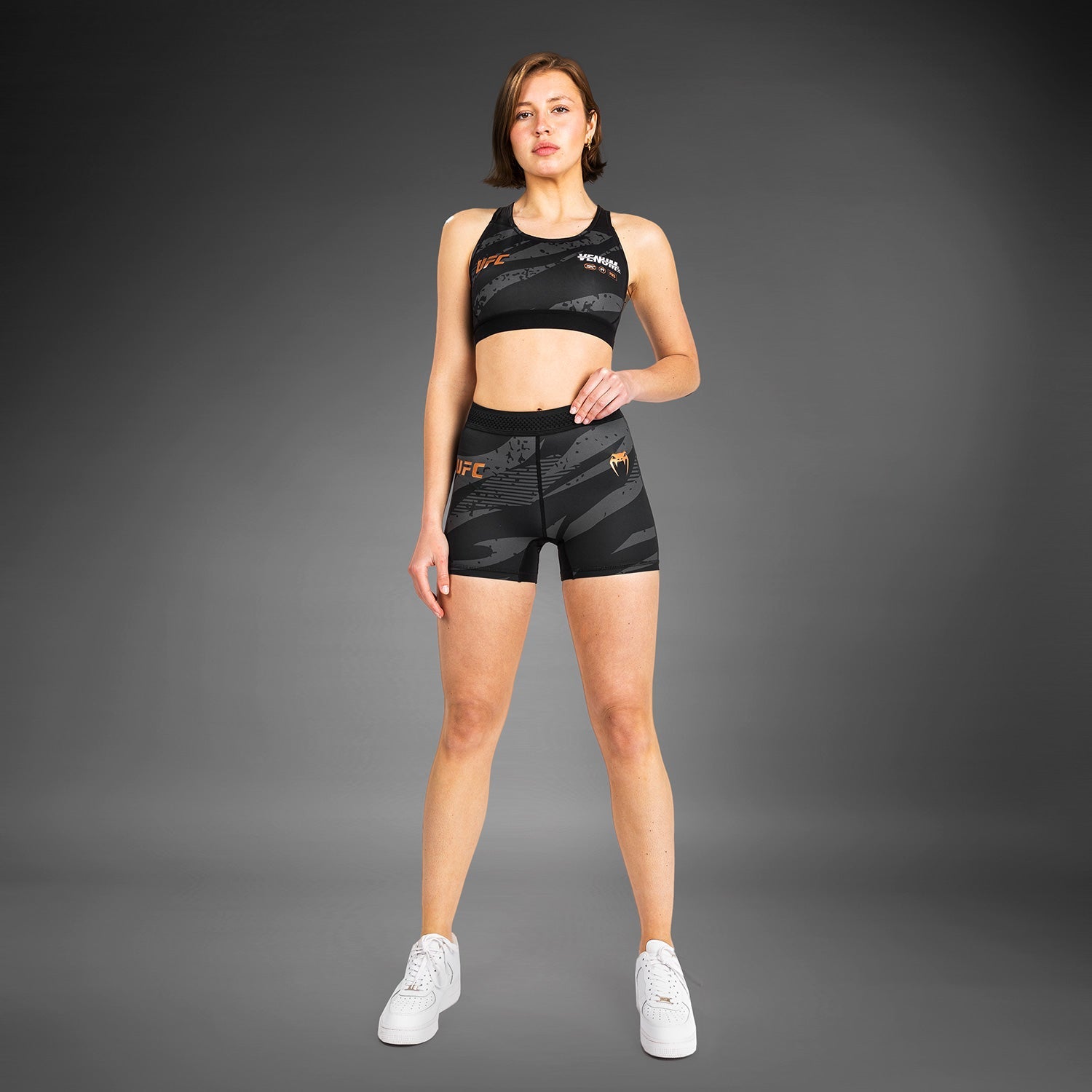 Son imprimé camouflage audacieux, agrémenté des détails du logo Venum et du logo UFC en rouge, bronze et blanc, s'inspire des athlètes qui pénètrent dans l'Octogone, prêts à frapper et à riposter.