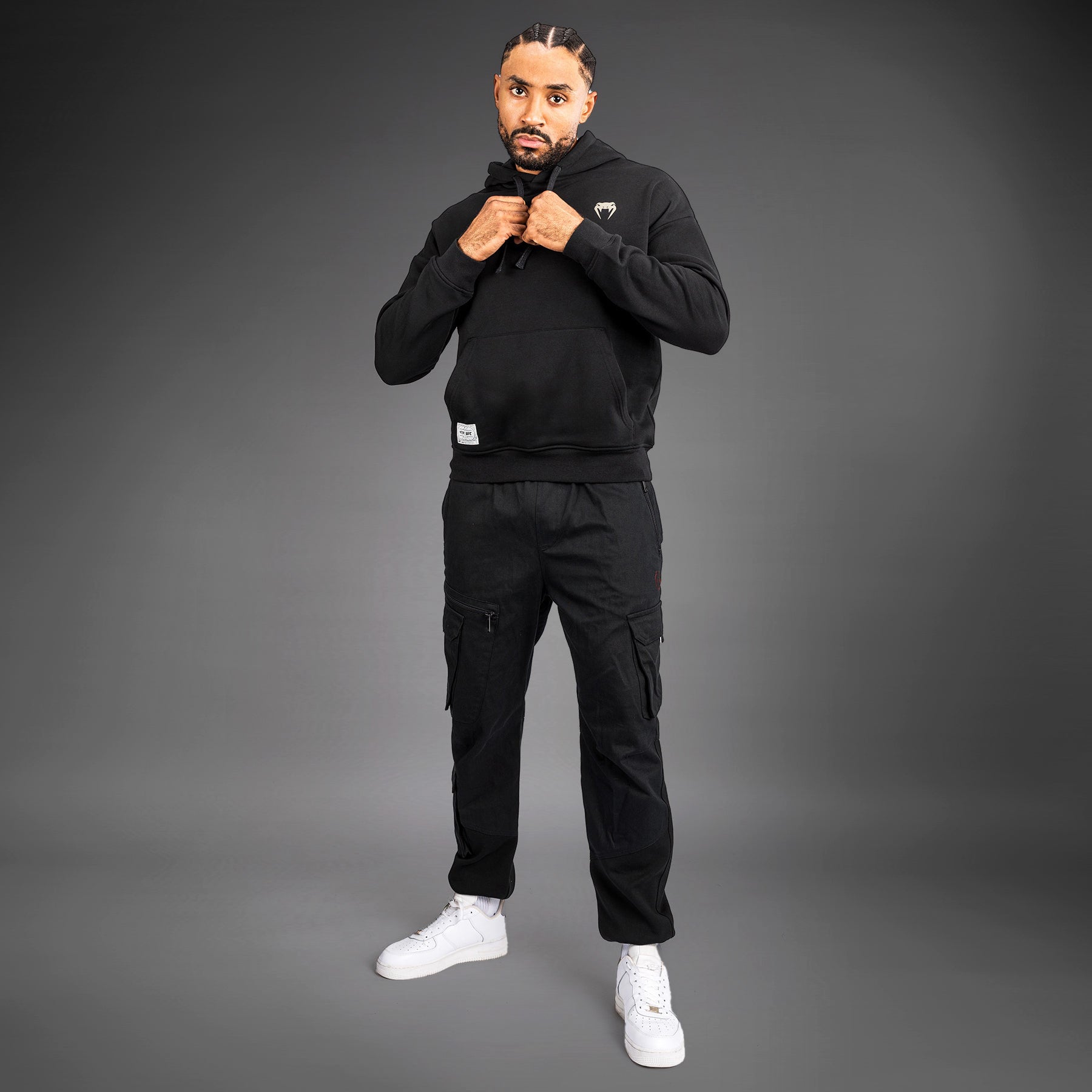 Sur ce sweat à capuche, le logo emblématique d'Ulti-Man occupe une place centrale, tandis qu'un écusson de marque se trouve sur la hanche. Le logo Venum se trouve dans le cou arrière.