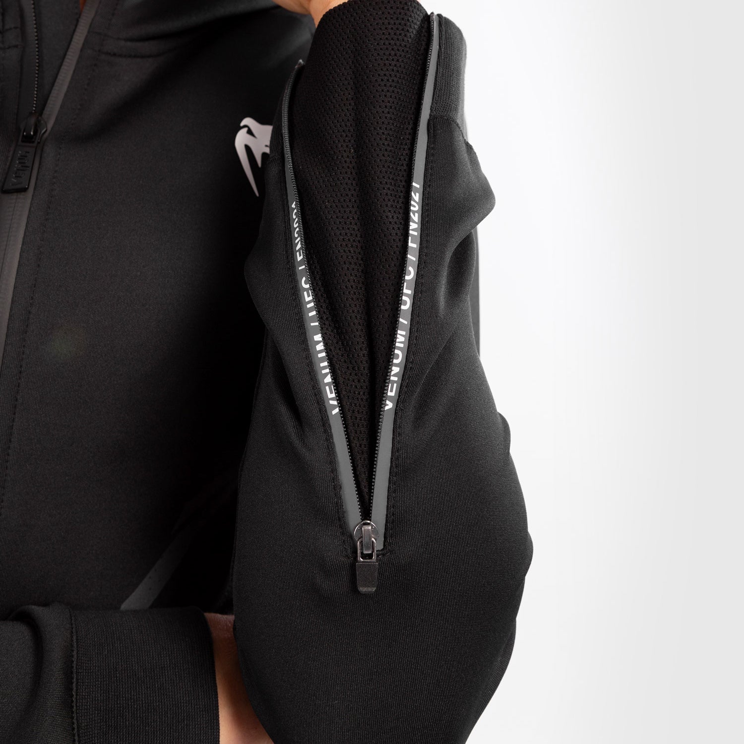 Le tissu est léger et respirant tout en restant légèrement extensible, offrant un maximum de confort et de liberté de mouvement. Les manches sont réglables pour permettre aux athlètes d'enfiler et d'enlever le sweat à capuche tout en portant des gants de MMA.