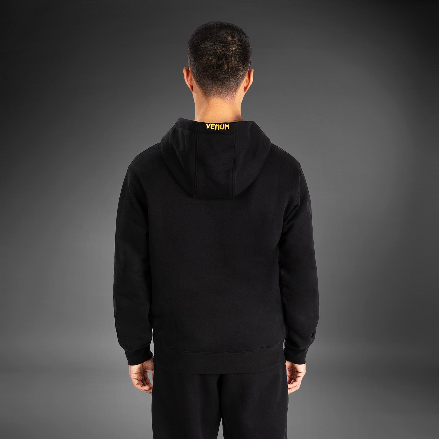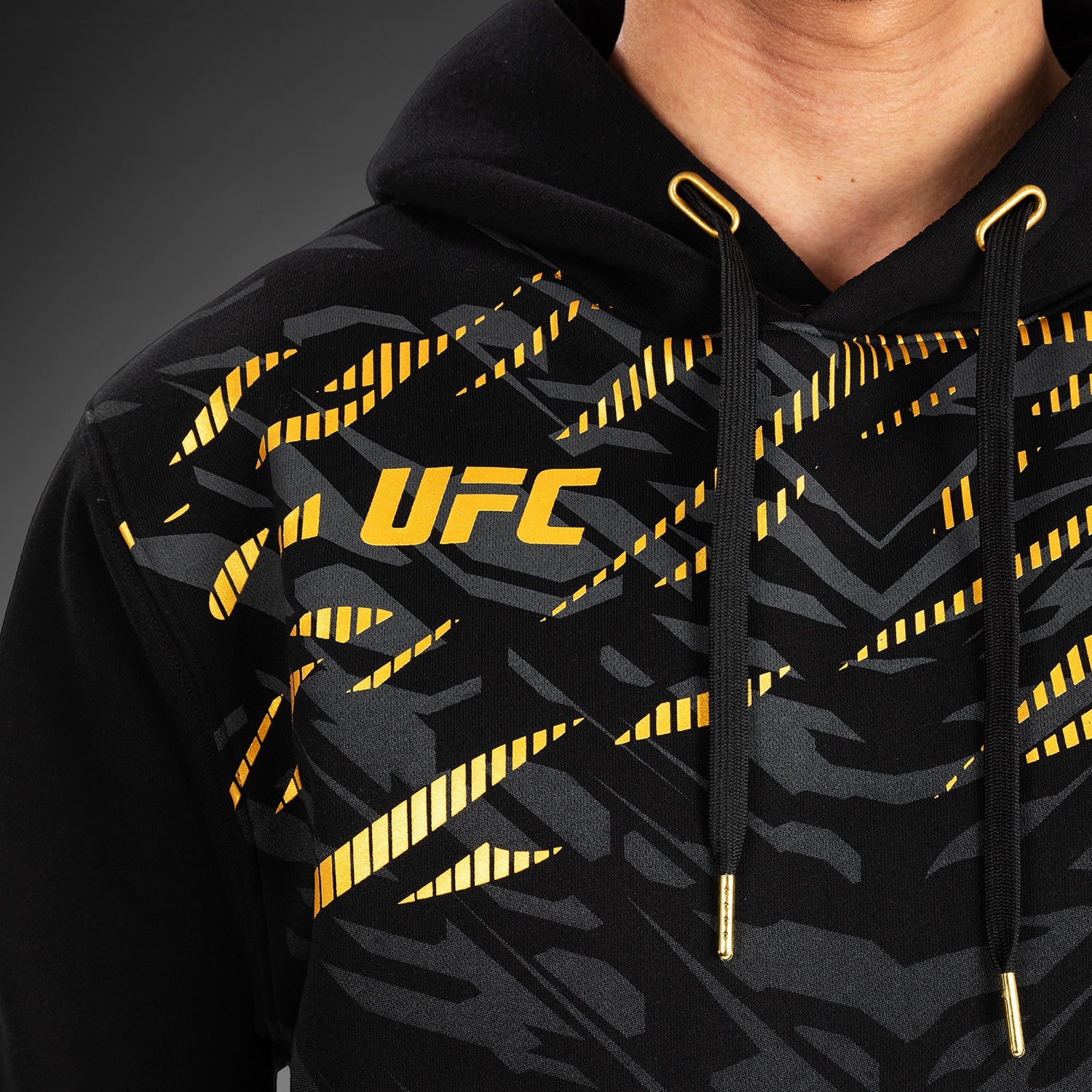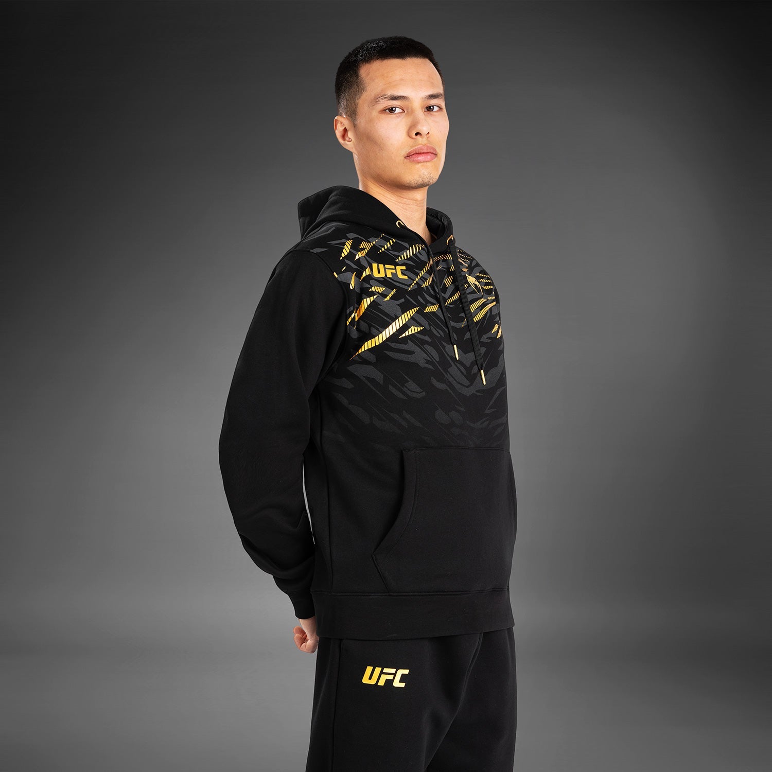 Le sweat à capuche à enfiler Replica pour hommes UFC Fusion par Venum dispose d'une poche avant style kangourou et d'une capuche avec cordon de serrage. Les logos Venum et UFC sont présents sur la poitrine et la capuche. Cette combinaison de couleurs noir/or est réservée aux champions de l'UFC.
