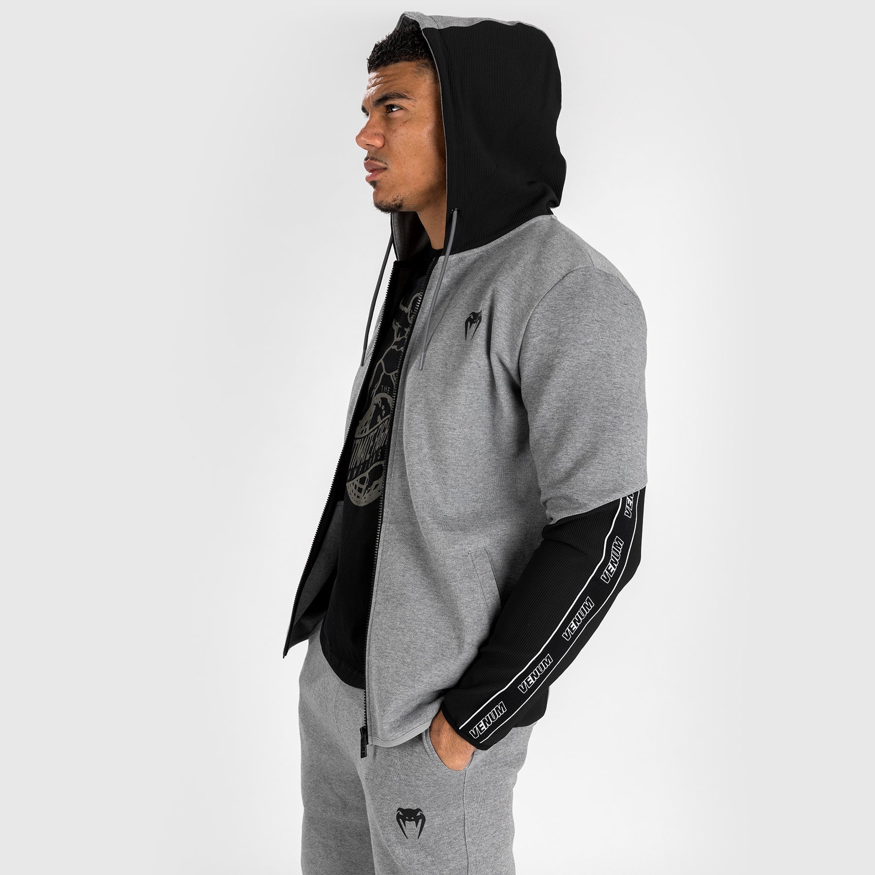 Les couleurs gris chiné et noir offrent un contraste au niveau des manches, de la capuche et du dos, tandis que le sweat à capuche comporte également des détails de marque sur le bas de la manche. Le logo Venum en forme de tête de serpent se trouve en noir sur la poitrine.
