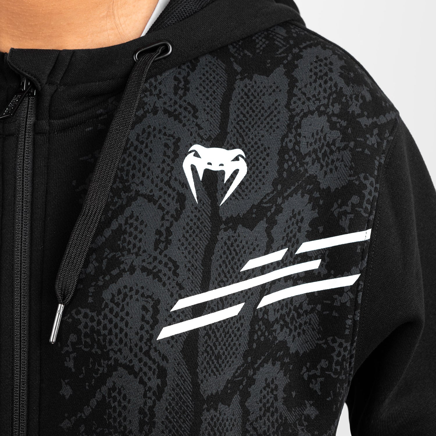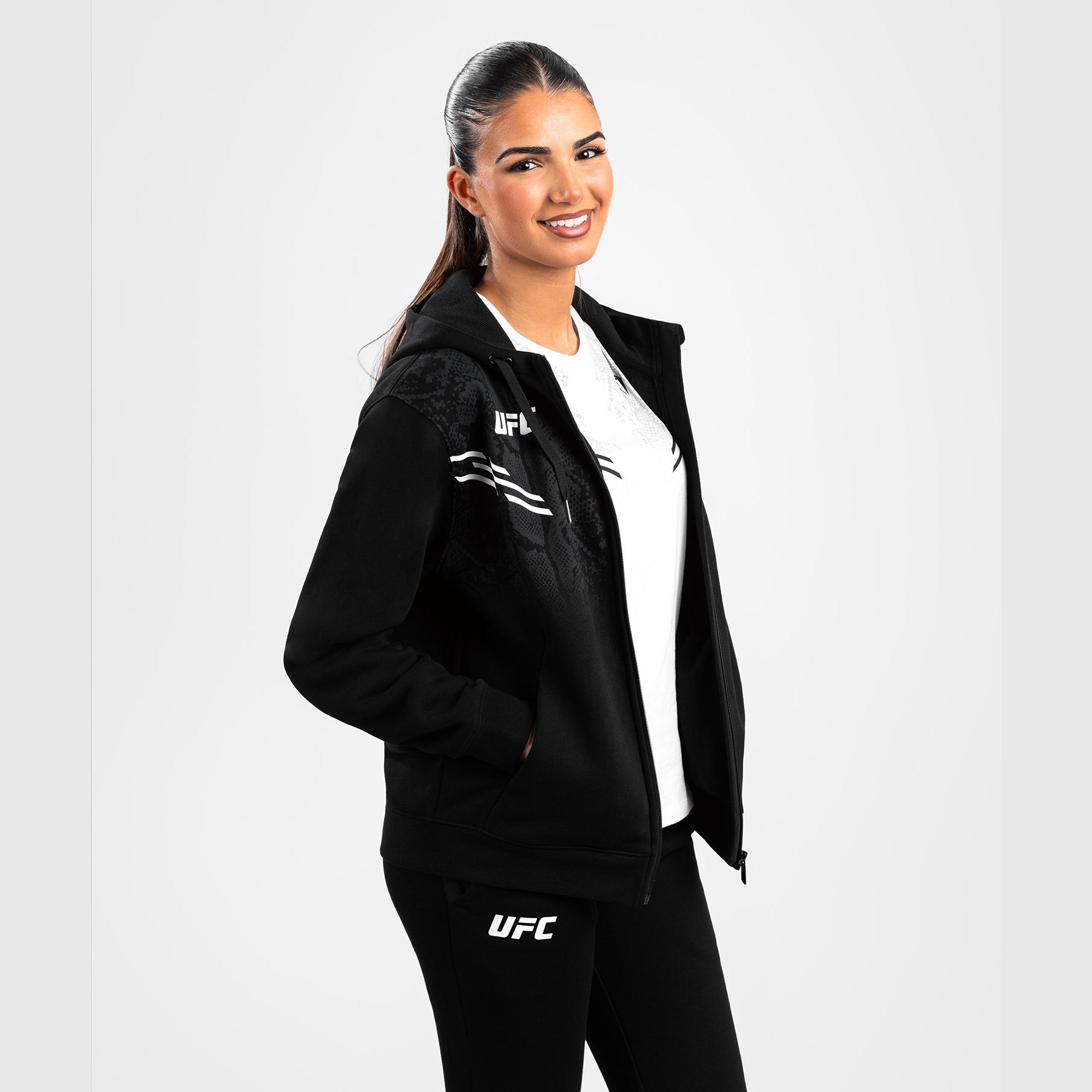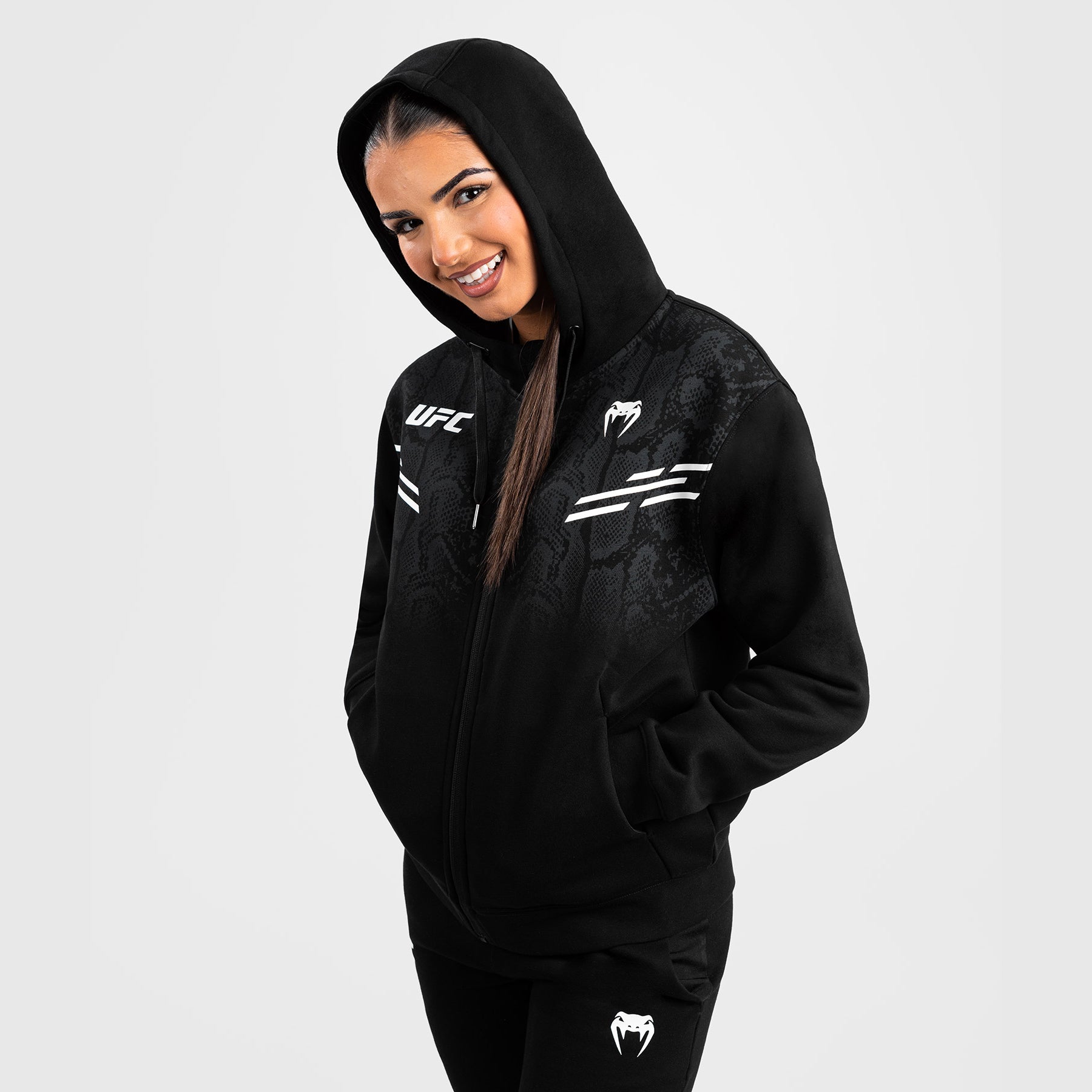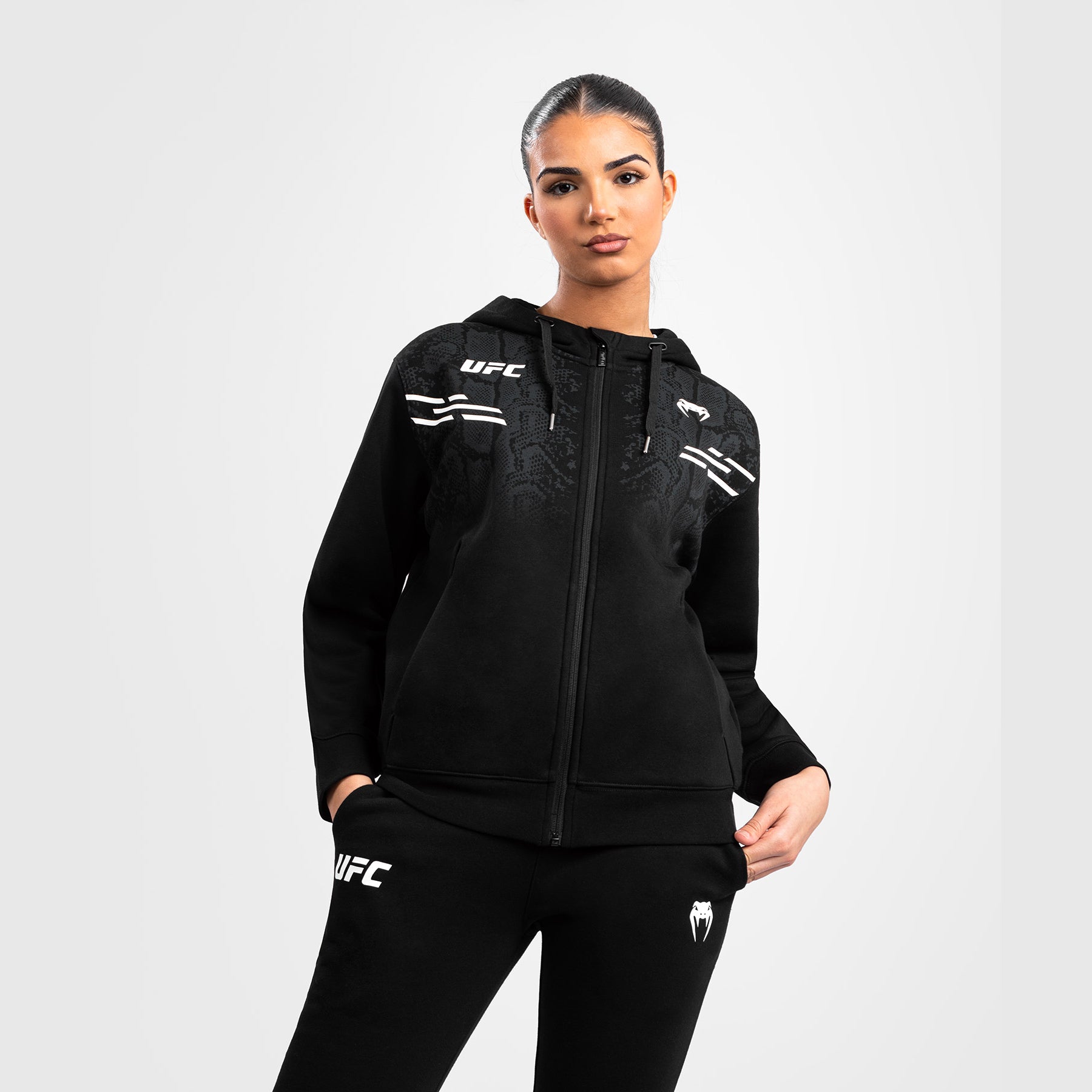 Le sweat à capuche zippé UFC Adrenaline by Venum Replica pour femme présente de subtils graphismes en peau de serpent sur le devant des épaules et sur la poitrine, ainsi que des logos blancs Venum et UFC.