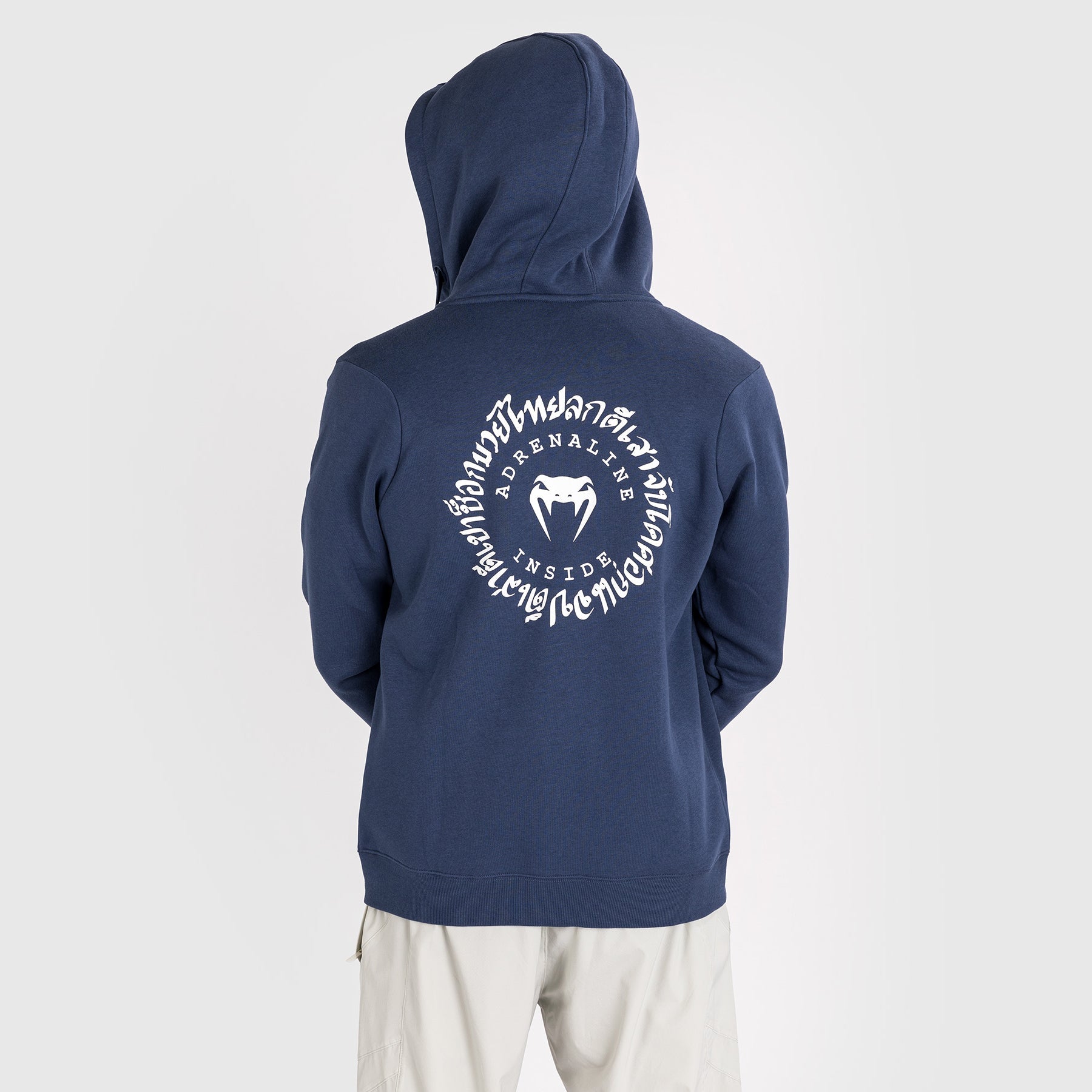 Le sweat à capuche Venum Strikeland Full Zip Hoodie bleu marine arbore le logo Venum en forme de tête de serpent en gris sur la poitrine. Dans le dos, des caractères thaïlandais entourent le logo Venum et la phrase "Adrenaline Inside" - un rappel de la force, de l'agilité et de l'adrénaline que ce sport exige de Nak Muay.