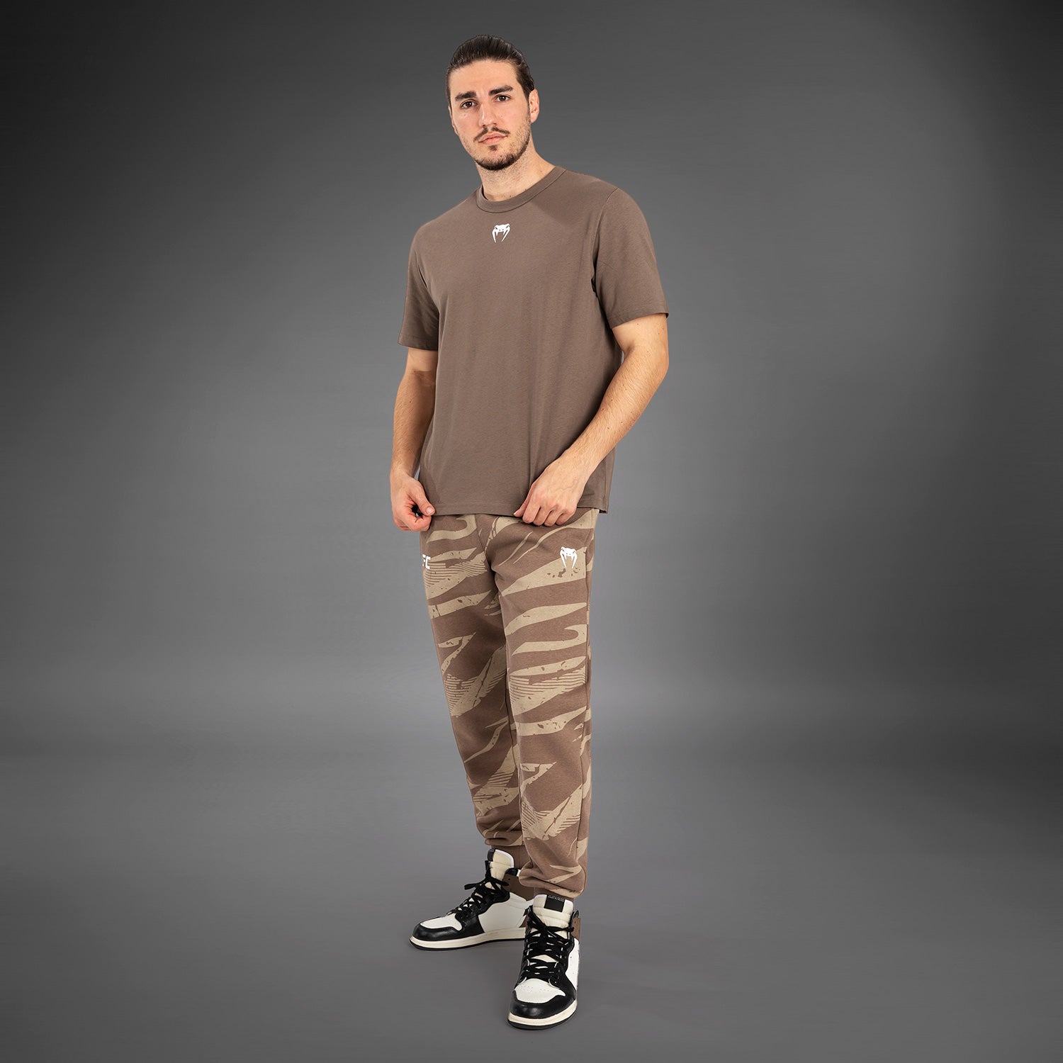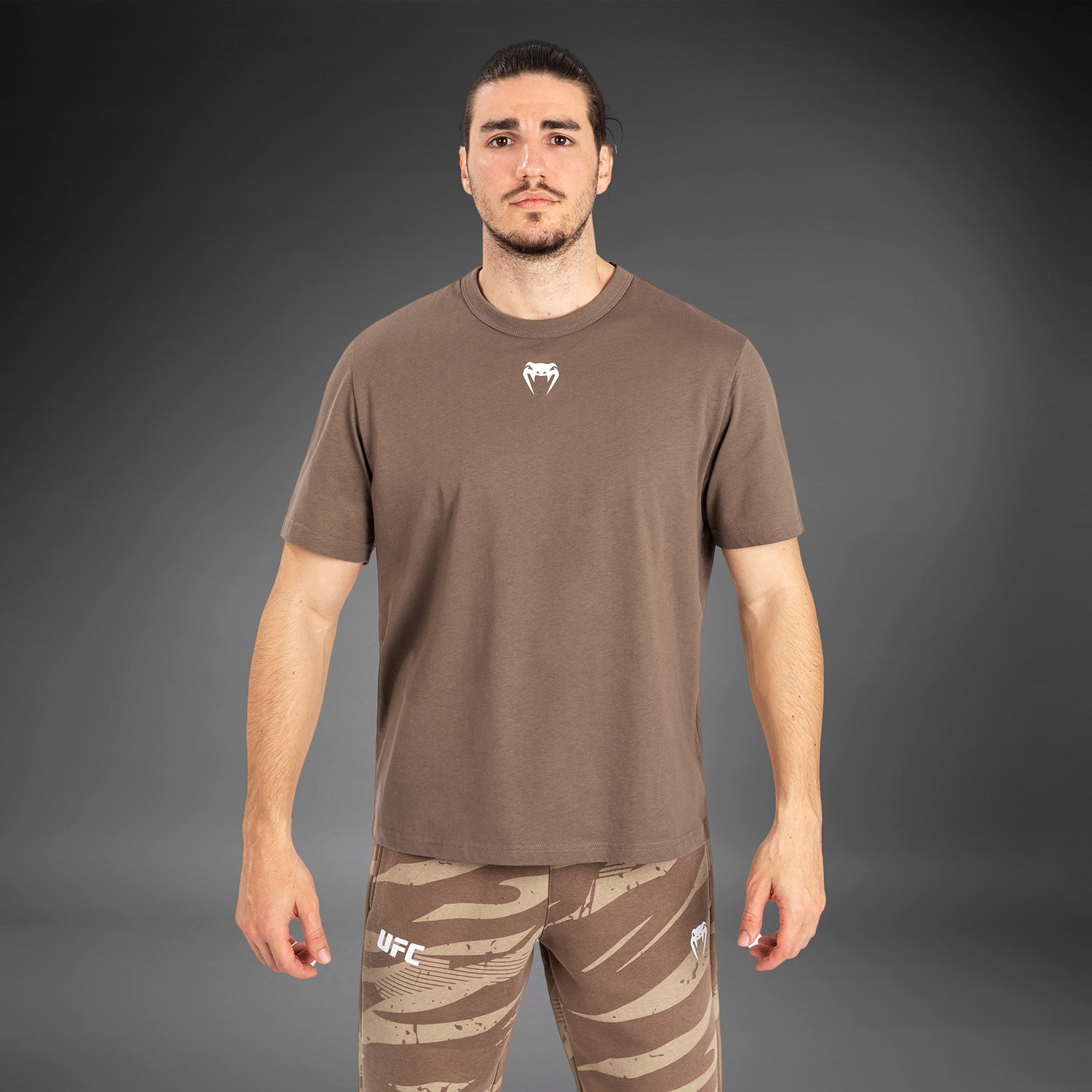 La teinte discrète du T-shirt, agrémentée des logos de l'UFC et de Venum en bronze, s'accorde parfaitement avec les autres pièces lifestyle de la même collection.