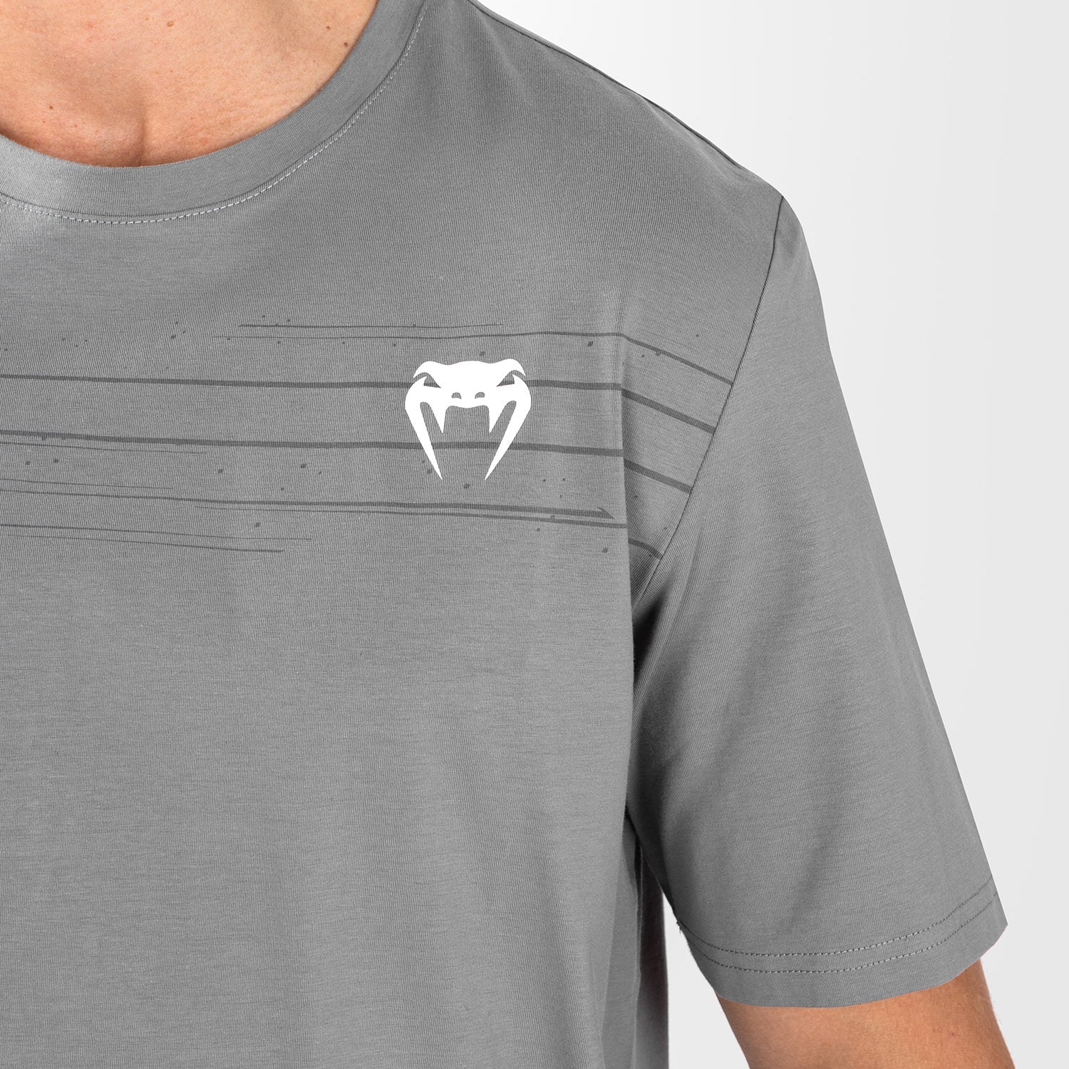Ce tee-shirt gris présente le graphisme dynamique de la collection en gris foncé dans le dos, ainsi que les logos UFC Performance Institute et Venum sur la poitrine.