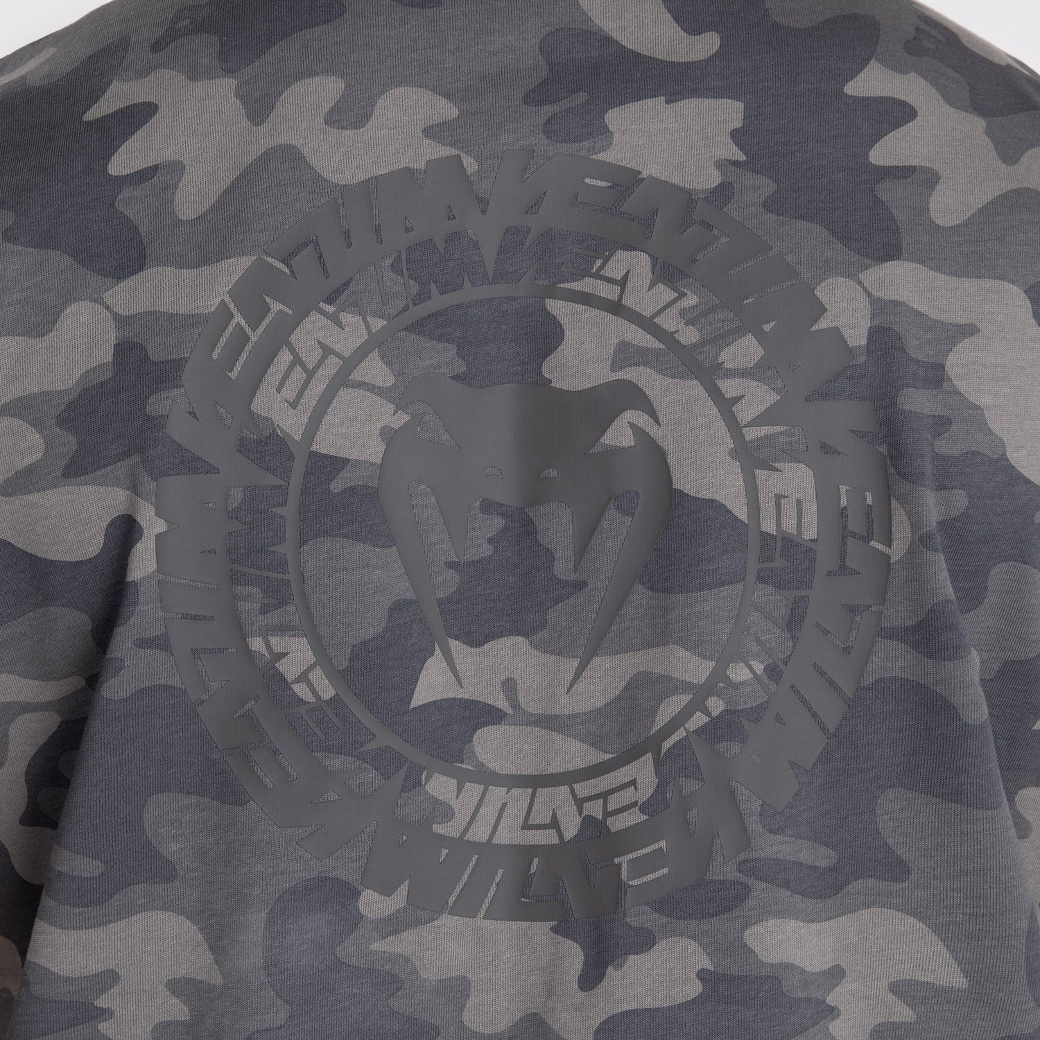 Le T-shirt pour homme Venum Vortex XL en Camo Anthracite présente le logo Venum brodé au centre de la poitrine en blanc. Le graphique du vortex en gris ton sur ton couvre le dos du t-shirt.
