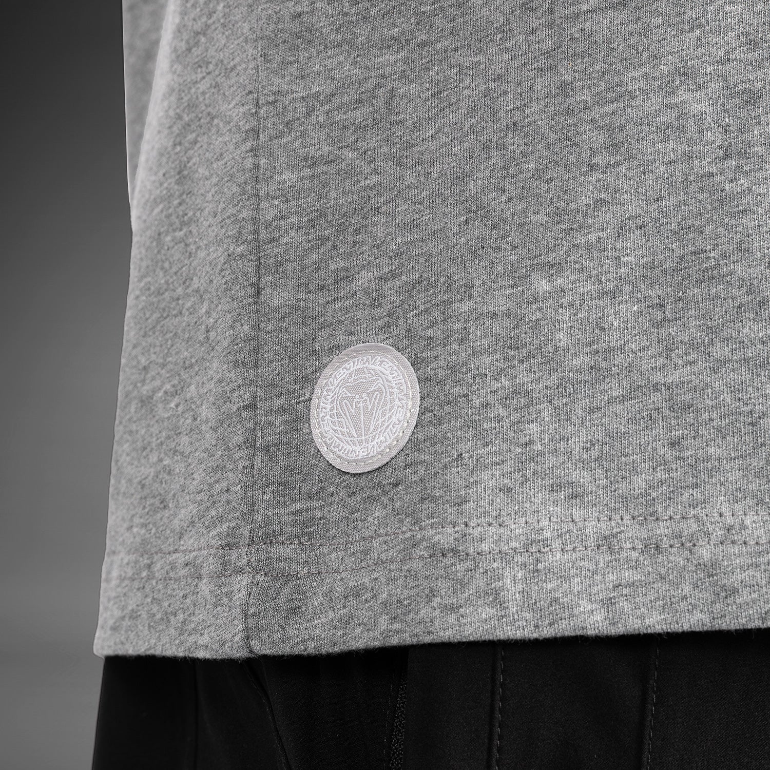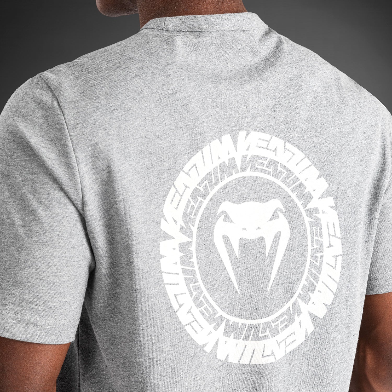 Le T-shirt pour homme Venum Vortex XL en gris clair chiné arbore le logo Venum brodé au centre de la poitrine en blanc. Le graphique du vortex couvre le dos du t-shirt, également en blanc.