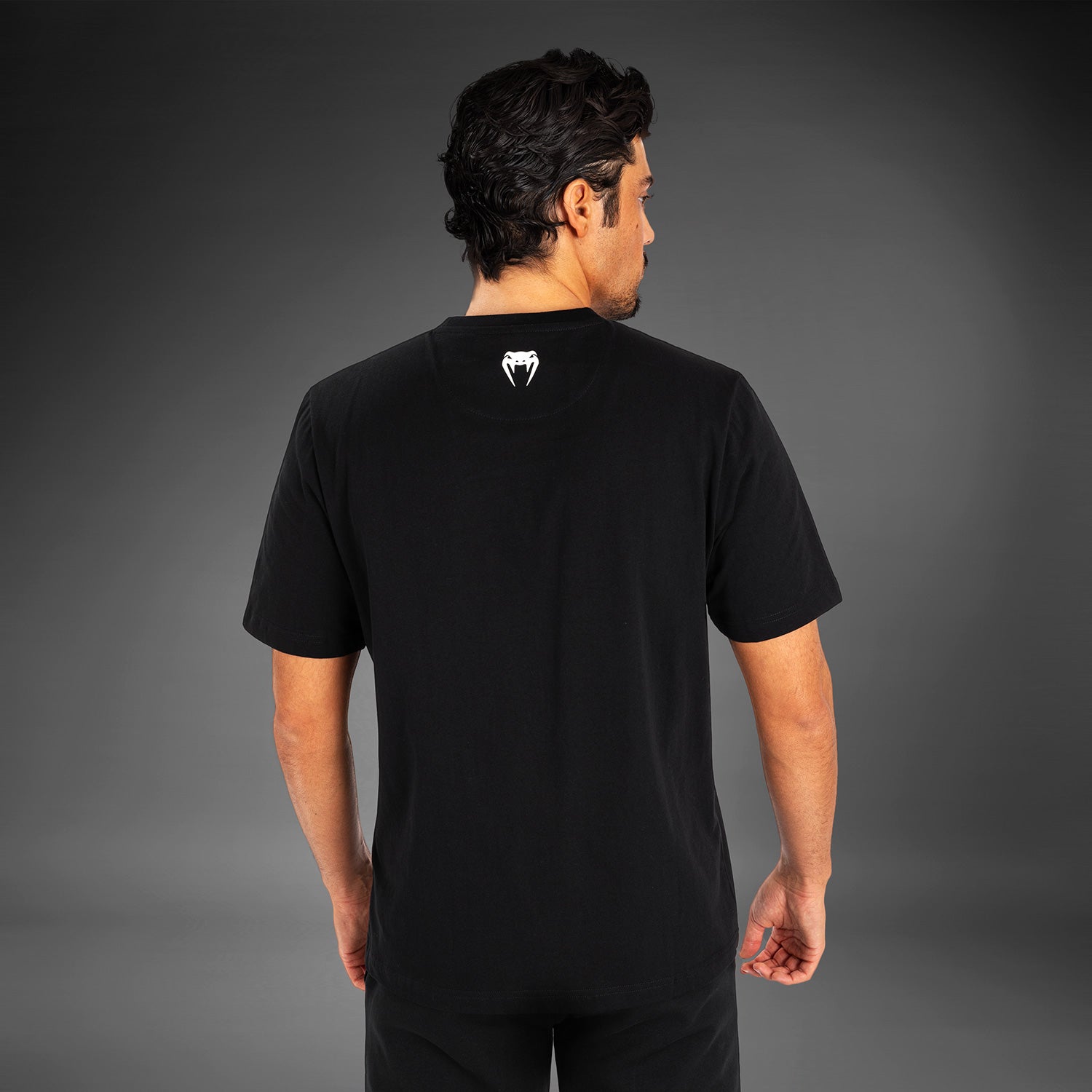 Sur ce T-shirt graphique noir à col ras du cou, le logo emblématique Ulti-Man en gris occupe le devant de la scène, tandis qu'un écusson de marque se trouve sur la hanche. Le logo Venum, également gris, est apposé dans le cou arrière.