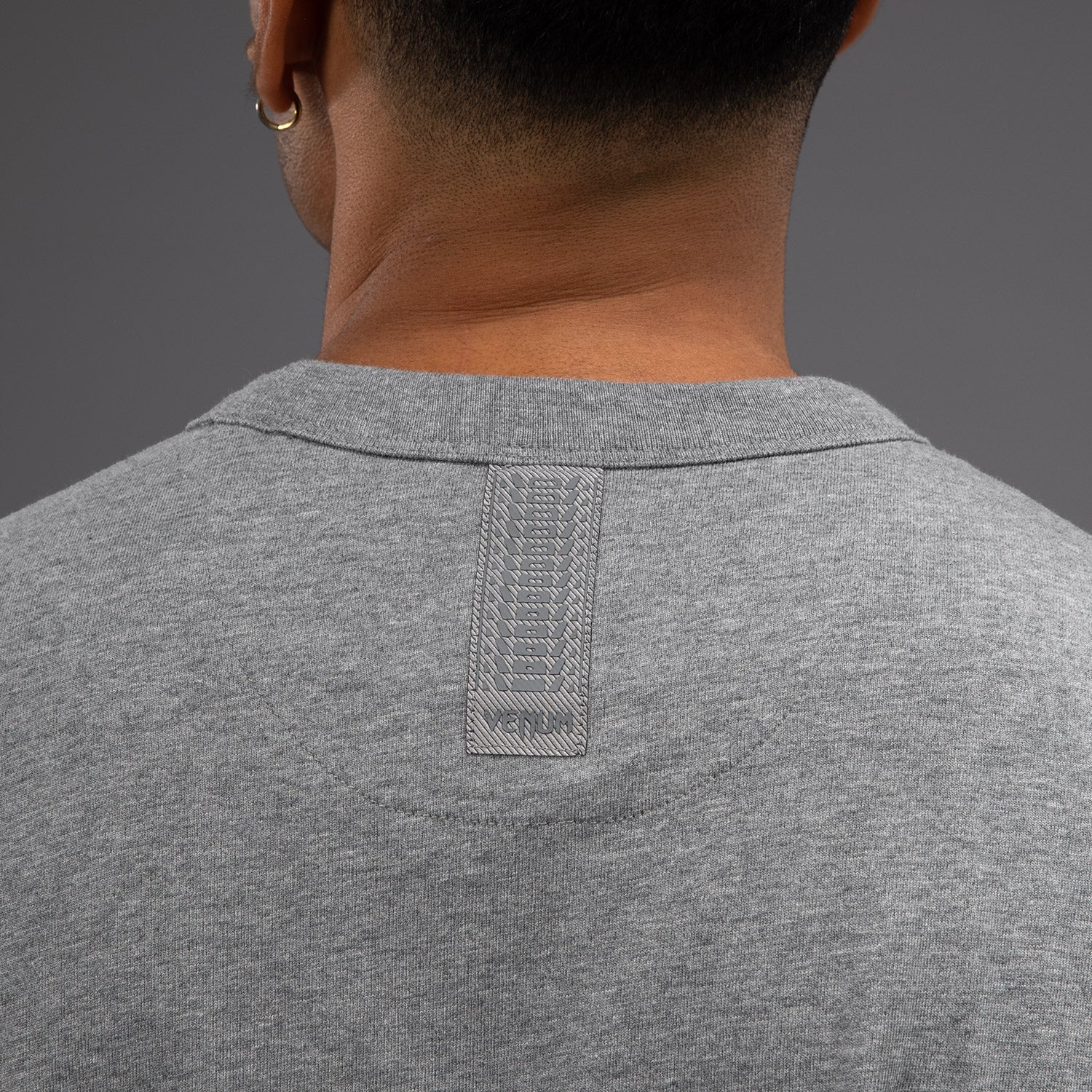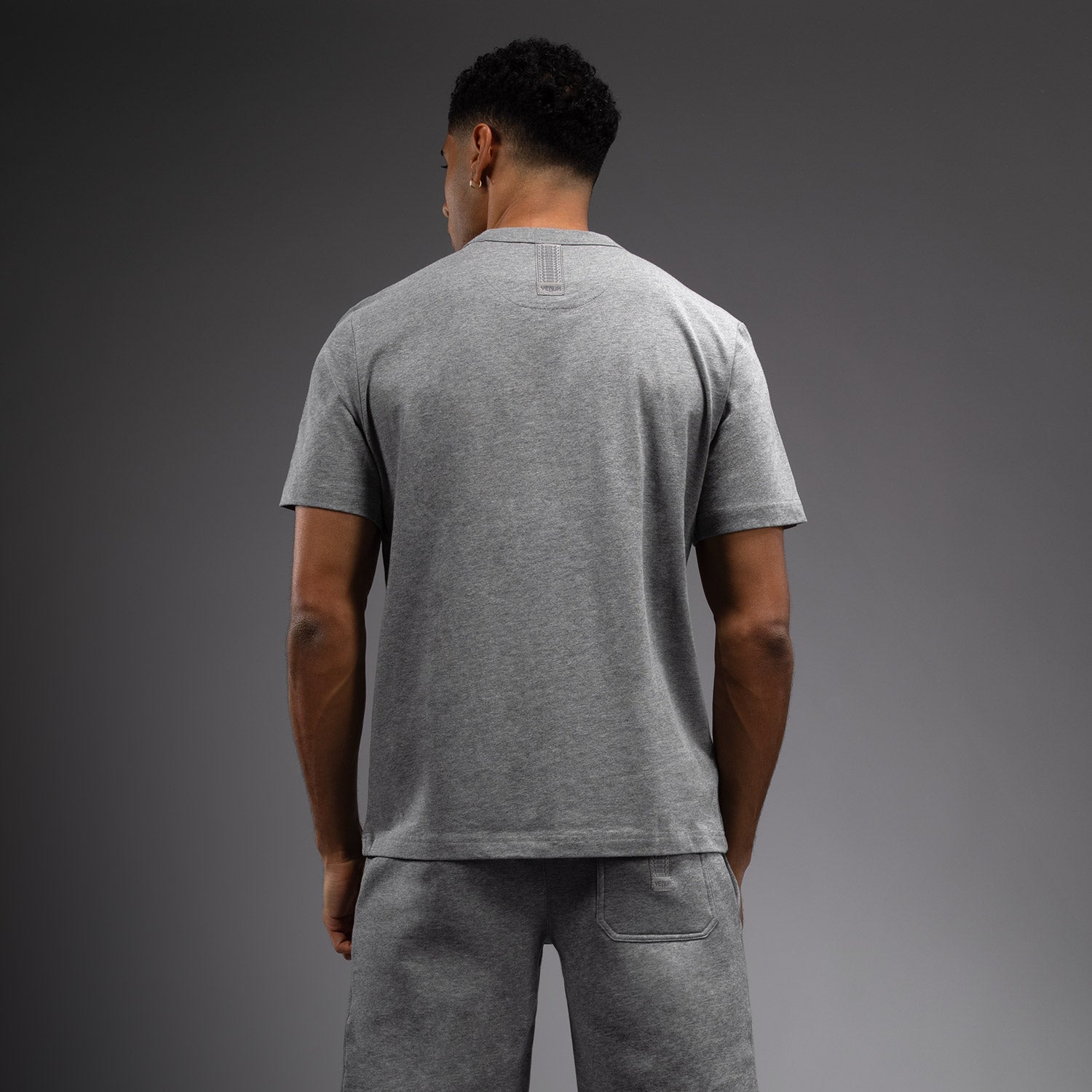 Le T-shirt Silent Power en Gris Nuage présente un col rond et des manches courtes, agrémenté d'un petit logo ton sur ton sur la poitrine et d'un motif logo à l'arrière du cou.