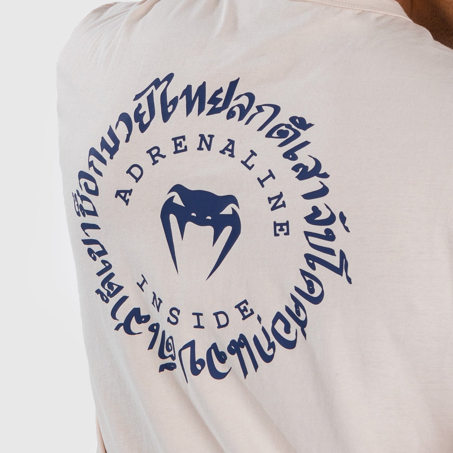 Le t-shirt Venum Strikeland Greigee arbore le logo Venum en forme de tête de serpent en gris sur la poitrine. Dans le dos, des caractères thaïlandais entourent le logo Venum et la phrase "Adrenaline Inside" - un rappel de la force, de l'agilité et de l'adrénaline que ce sport exige de Nak Muay.
