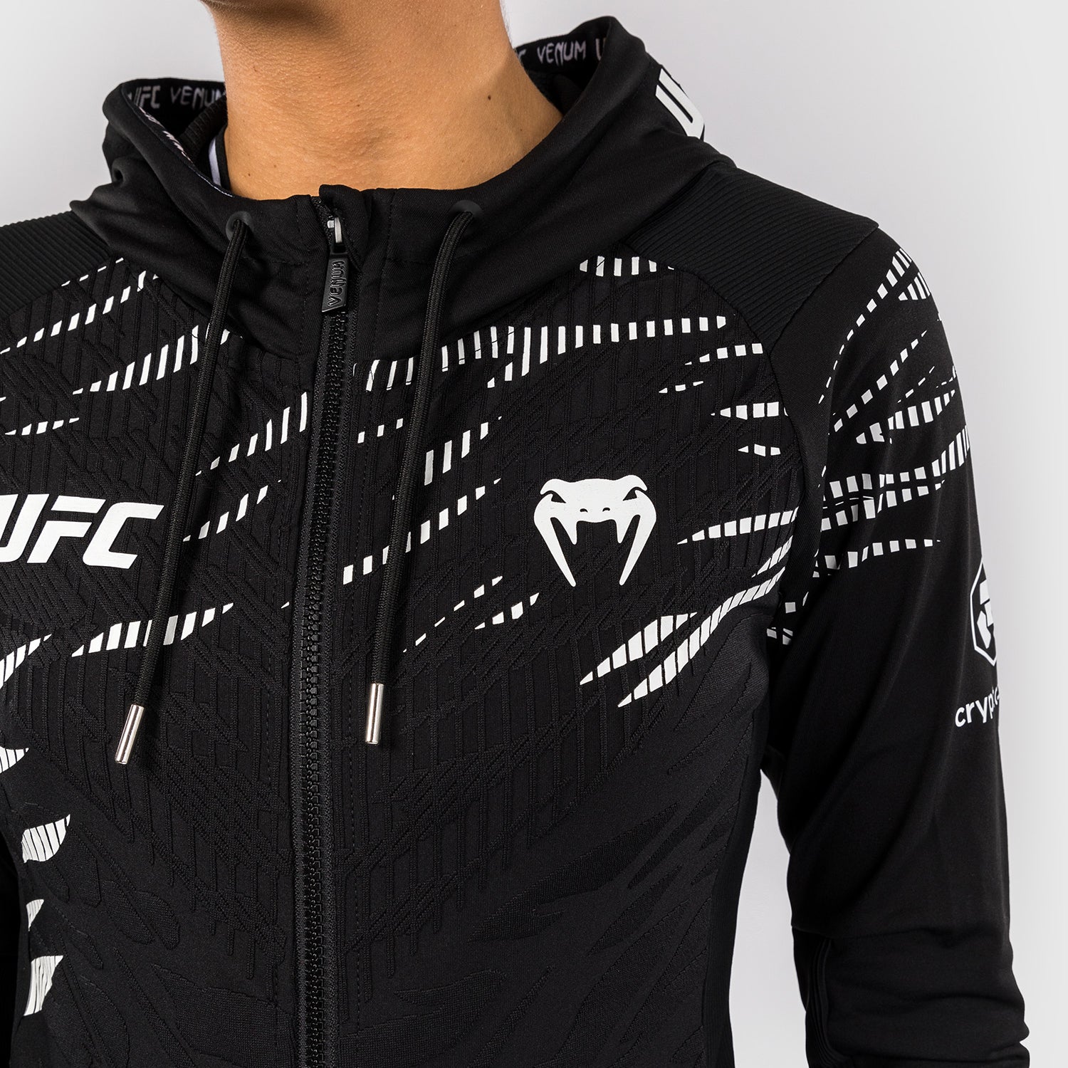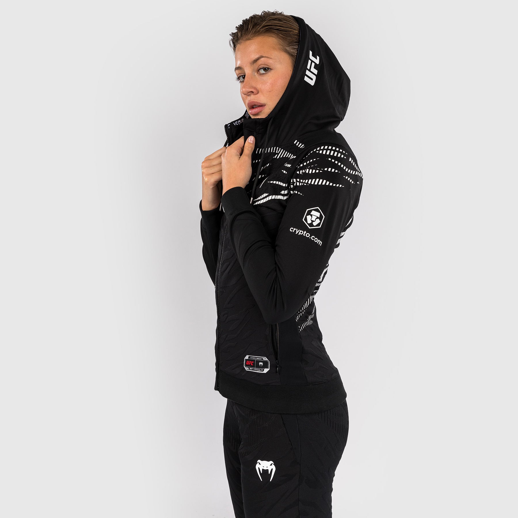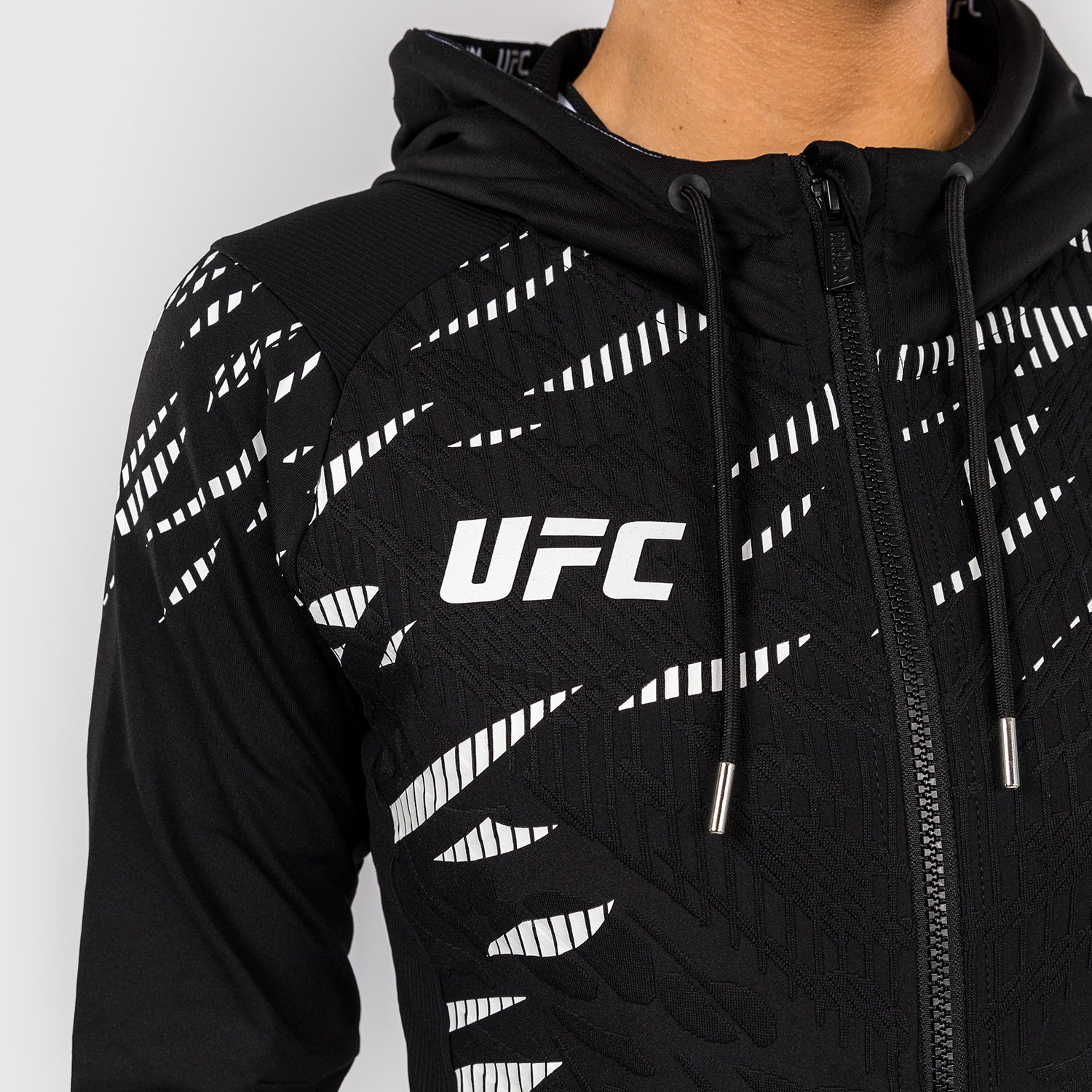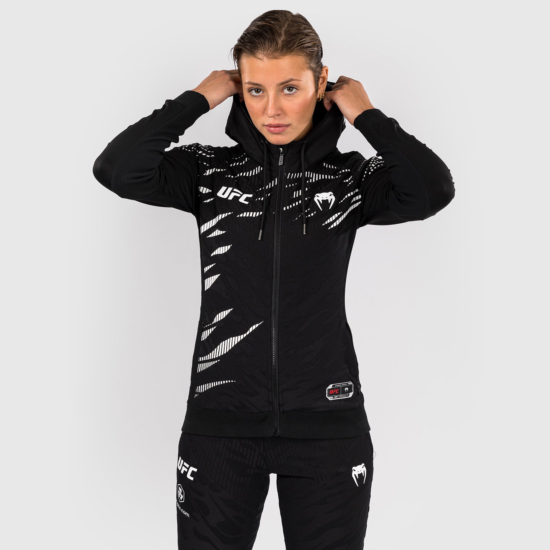 Le hoodie de sortie pour femmes UFC Fusion par Venum Authentic Fight Night présente deux poches zippées, ainsi qu'une capuche doublée en mesh avec des cordons de serrage réglables. Les poignets et le panneau intérieur des bras sont fabriqués avec un tissu extensible de qualité supérieure, permettant aux athlètes d'enlever leurs hoodies sans retirer leurs gants.
