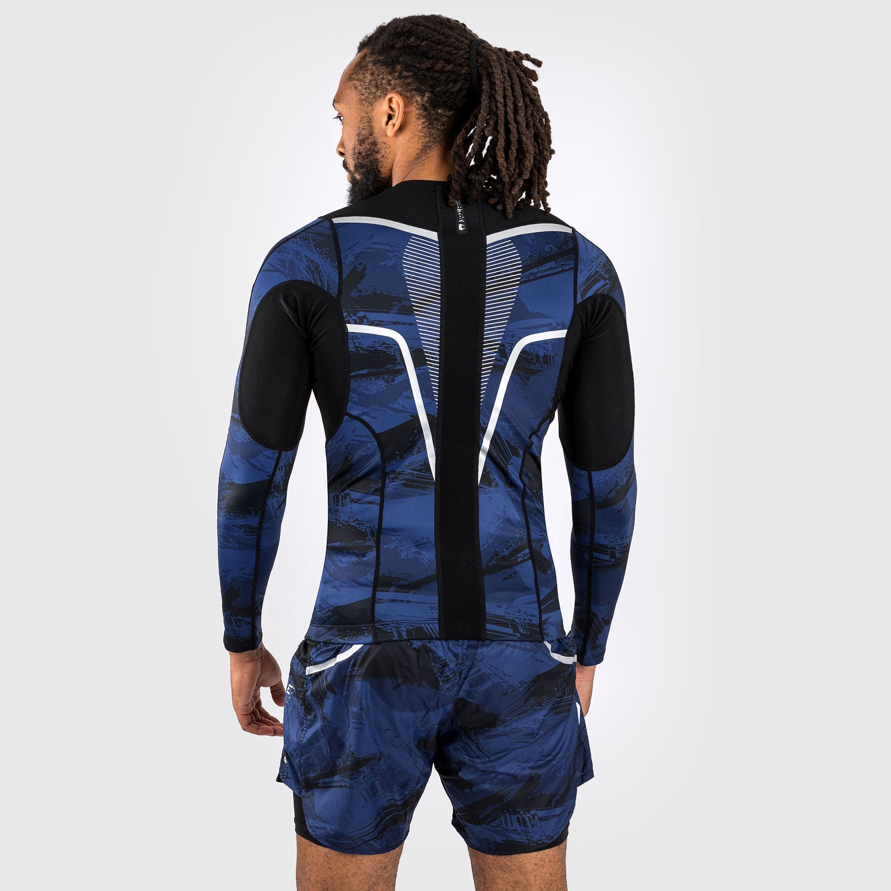 L'imprimé camouflage à coups de pinceau en bleu marine confère au rashguard un style urbain, avec un logo Venum argenté sur la poitrine, les manches et l'arrière du cou.