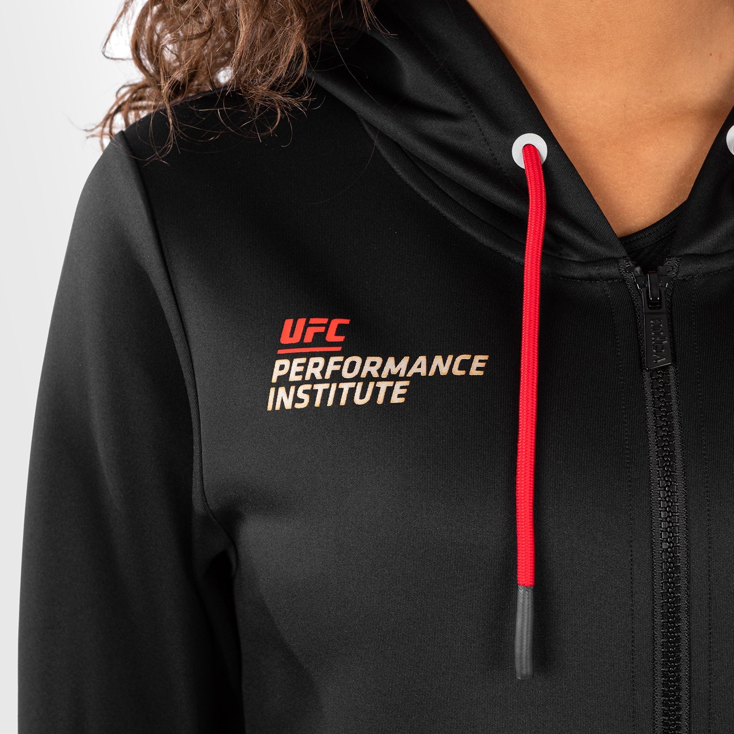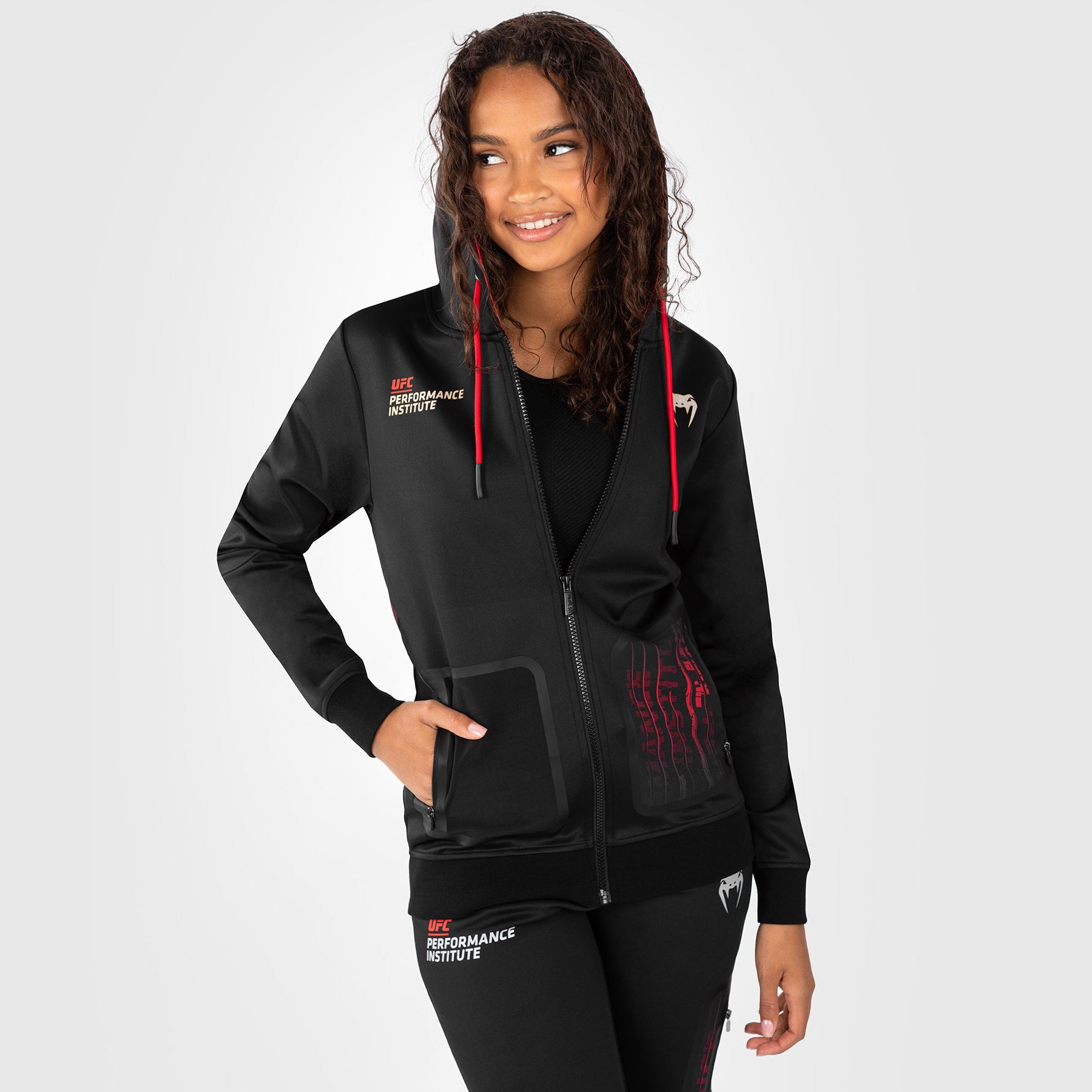 Cette veste à capuche haut de gamme pour femme, de couleur noire, présente une doublure rouge contrastante au niveau de la capuche et un cordon de serrage rouge. Le graphisme dynamique de la collection couvre le dos du sweat à capuche et la poche avant, avec les logos UFC Performance Institute et Venum sur la poitrine.