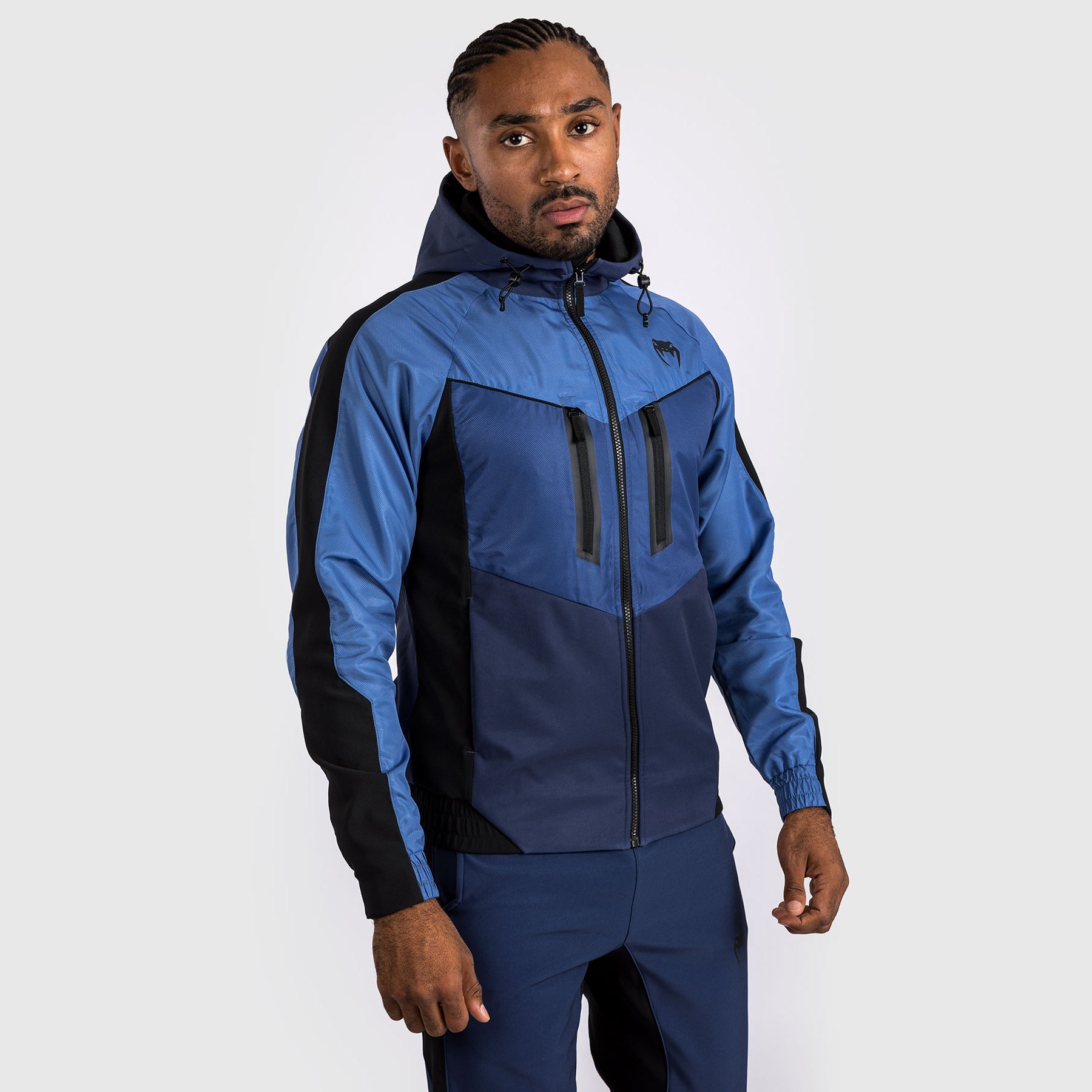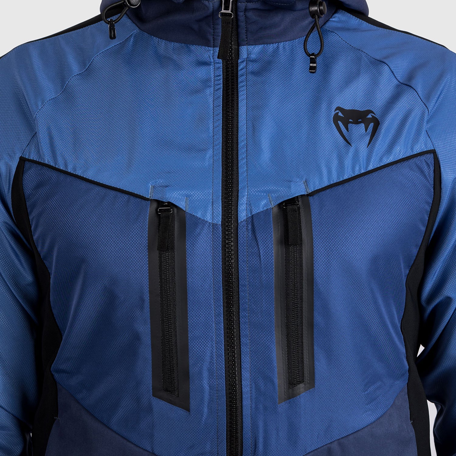 Les fermetures éclair noires et le logo Venum noir sur la poitrine contrastent avec les tons bleus du sweat à capuche pour une finition sportswear saisissante.